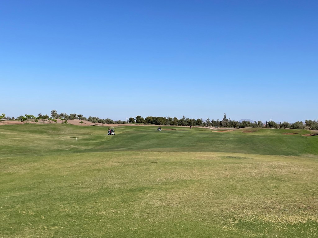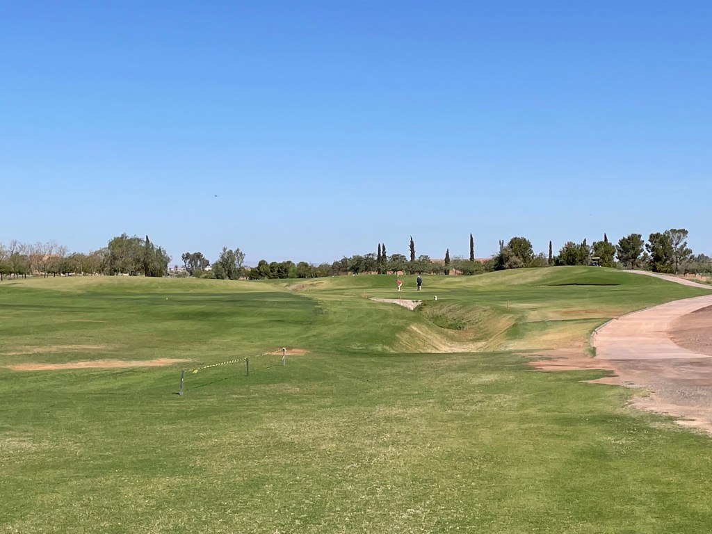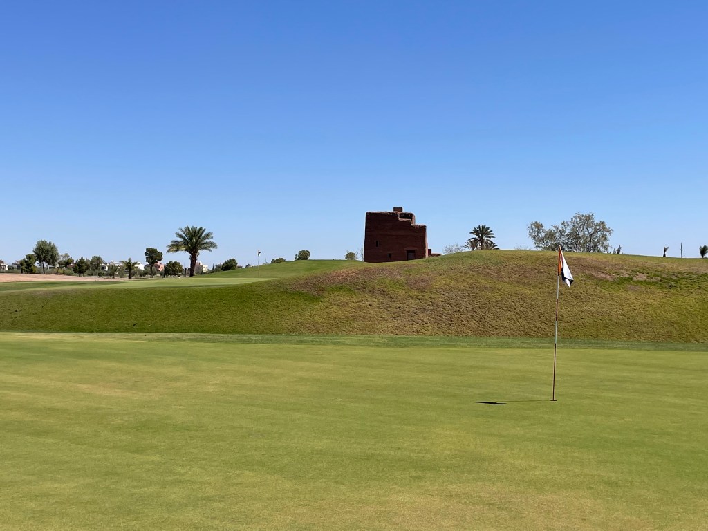 Neugierig sind wir jetzt, was die tollen, maurischen Riesentürme bedeuten, die man schon von weither sieht. Relikte aus alter Zeit? Die Antwort ist profan: Man hat hier die Toiletten untergebracht. Die nächste Bahn spielen wir Richtung Atlasgebirge, was sich optisch wunderschön macht. Das sanfte Dogleg endet mit einem erhöhten Grün, schnell wie alle anderen hier und in ebensolchem ausgezeichneten Zustand. Generell ist der Platz sehr gepflegt und das Bermudagras, das im Winter braun daherkommt, fast überall bereits saftig grün. Nur 127/108 Meter lang ist dann das Par 3 der 6, und der Anblick der Topfbunker unter dem Grün macht mir (zu Recht) Sorgen. Es ist wieder unglaublich heiß heute, nahe 35 Grad und wir sind froh über den Fahrtwind im Cart. Schatten gibt es auf dem gesamten Platz, der noch nicht einmal 10 Jahre alt ist, nämlich absolut keinen. Die paar gepflanzten Palmen sind dem Spiel wenigstens nicht im Weg.