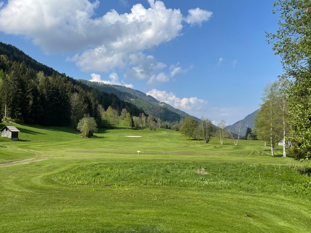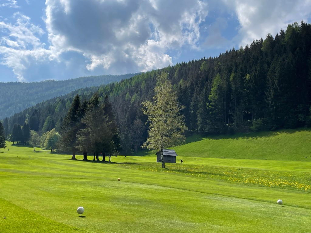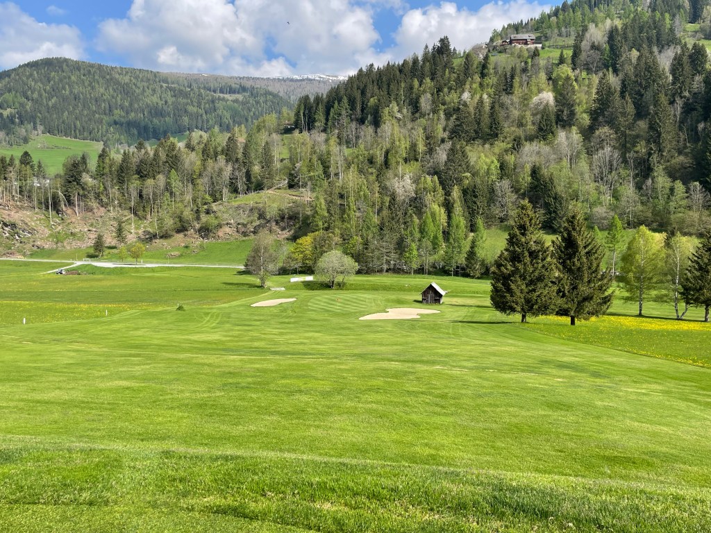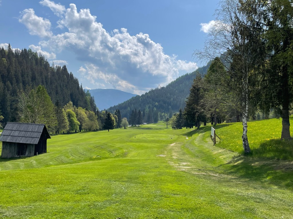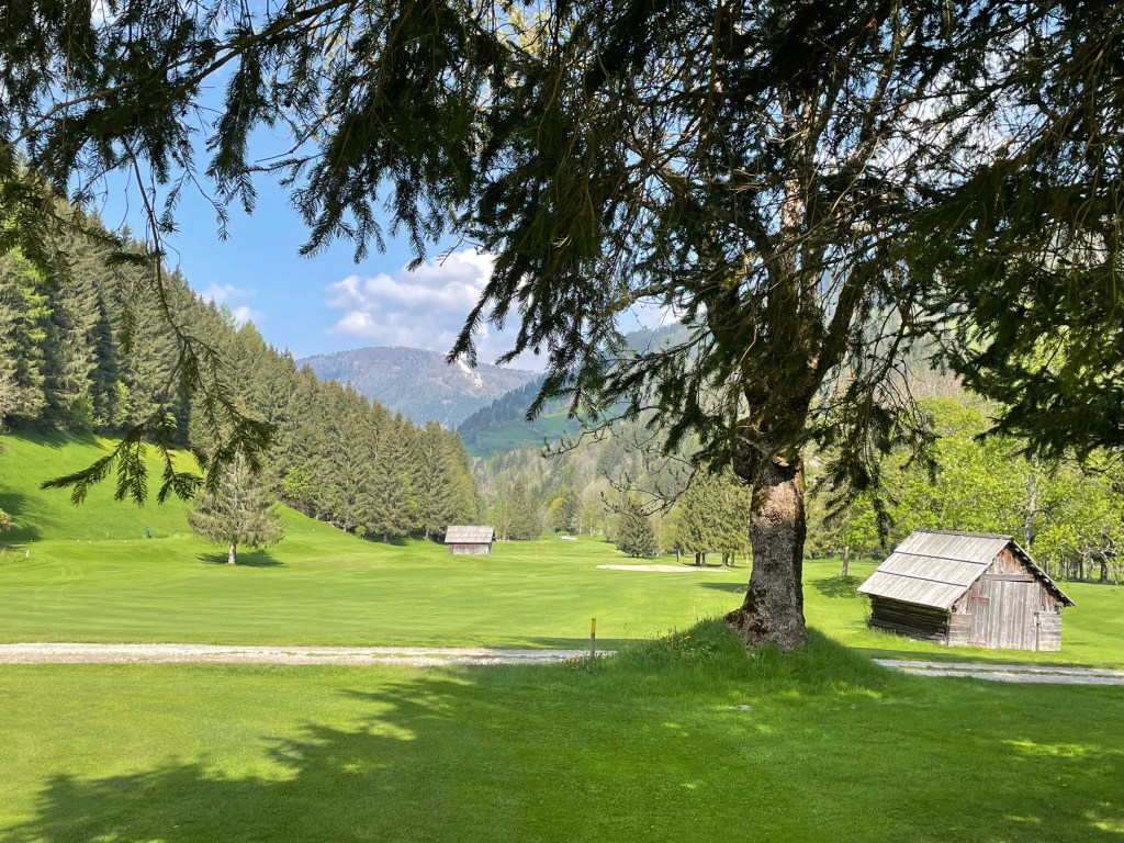Erstens: Der Start ist angenehm, die ersten Löcher spielen sich auf wellig grünen Fairways sanft bergauf und leicht bergab. Platz ist nur scheinbar genügend, denn Birken, Föhren und die jetzt Ende Mai hier heroben erst grün werdenden Lärchen säumen die Bahnen. Dazwischen, als hätte man sie einfach so hingestreut, malerische Holzschober – rundherum in jeder Richtung Berge, jetzt noch mit ein bissl Schnee drauf.