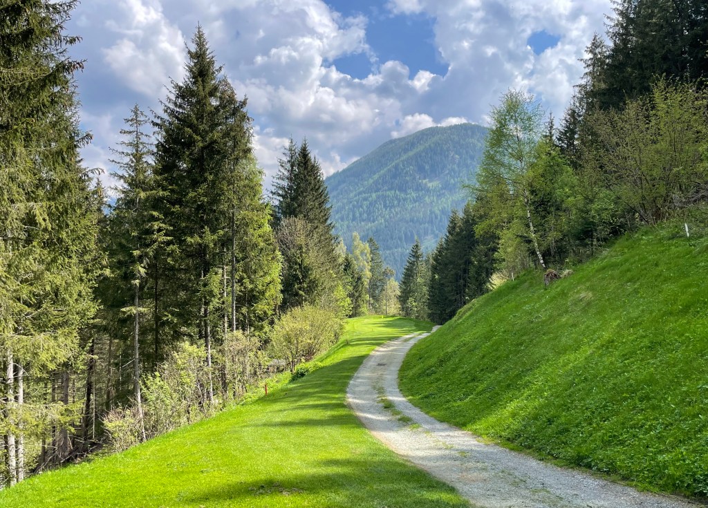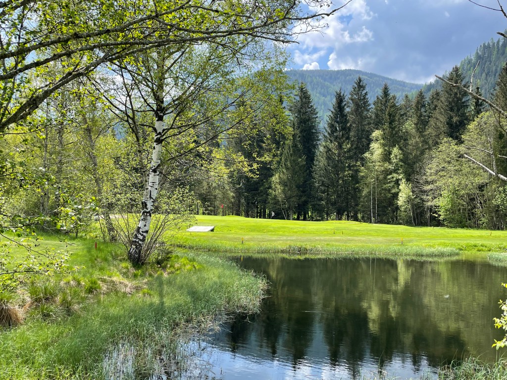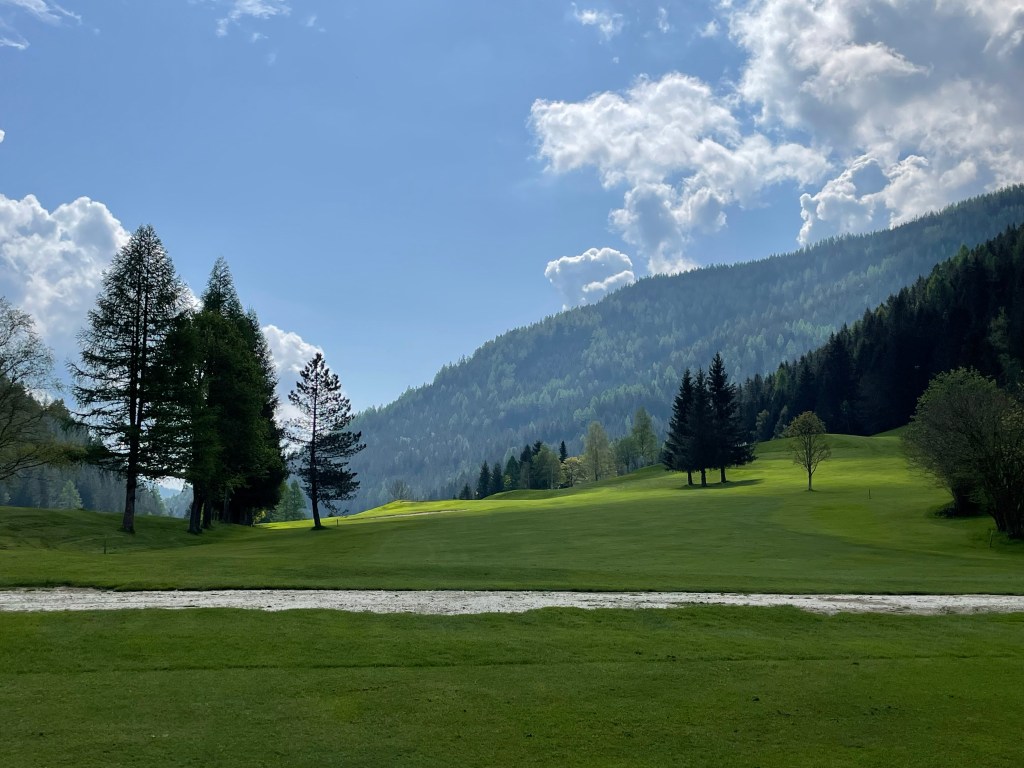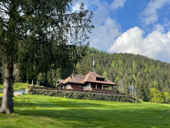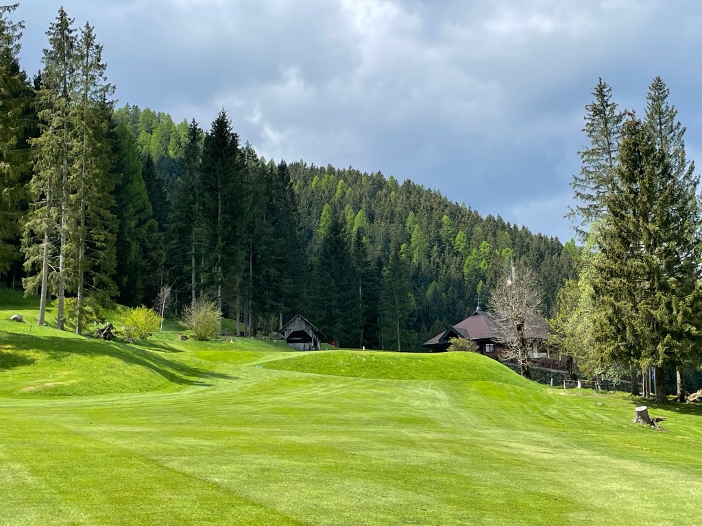 Erstens: Der Start ist angenehm, die ersten Löcher spielen sich auf wellig grünen Fairways sanft bergauf und leicht bergab. Platz ist nur scheinbar genügend, denn Birken, Föhren und die jetzt Ende Mai hier heroben erst grün werdenden Lärchen säumen die Bahnen. Dazwischen, als hätte man sie einfach so hingestreut, malerische Holzschober – rundherum in jeder Richtung Berge, jetzt noch mit ein bissl Schnee drauf.