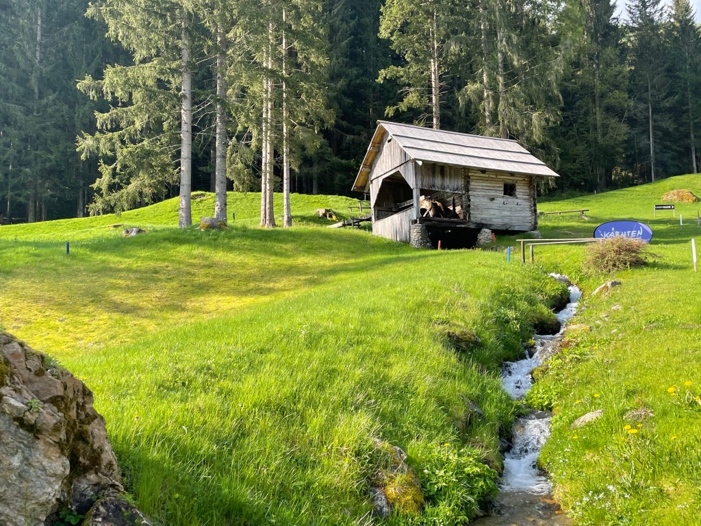 Konditionell auf den letzten Bahnen wenig belastet, hat man jetzt einen langen Bergaufweg vor sich, der mitten im Wald endet, vor einem kurzen Par 3: die 17, auch hier Mattenabschläge. Die 120/108 Meter sind nicht das Problem, die Schwierigkeit liegt in der Optik! Durch den Wald geht es wieder lange zurück Richtung Clubhaus, vor dem man noch die 18 überwinden muss. Das Par 4 führt bergauf zum sehr hoch gelegenen Grün, das dafür völlig ohne Bunker auskommt. Nach dem letzten Putt des Tages kommt man am wohl bekanntesten Fotomotiv vom Bad Kleinkirchheimer Golfplatz vorbei: dem Mühlrad. Wie sehr freue ich mich auf ein Getränk auf der sonnigen Clubhausterrasse, die hat Ende Mai aber leider noch geschlossen. Muss im Sommer, mit Blick auf die 1, die 9 und die Nockberge aber wunderschön sein.
