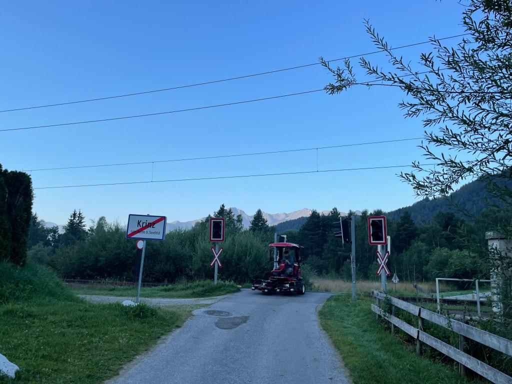 Der Kurs startet mit einem gefällig breiten Par 5, noch liegt Tau auf dem Fairway. Gegen Ende wird es schmäler, das Grün gut anzuspielen. Die schwierigste Bahn des Platzes habe ich mit einem Bogey hinter mich gebracht. Von der führt der Weg zur 2 über die Geleise der Regionalbahn zwischen Innsbruck und Garmisch. Ein unbeschrankter Bahnübergang, ein Greenkeeper kommt mir entgegen. Das Par 3 der 2 besteht praktisch nur aus einem Biotop, rechts ist ohnehin kein Platz, und du brauchst Carry bis knapp vor das Grün, und das sind immerhin 151/128 Meter.