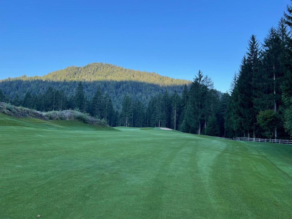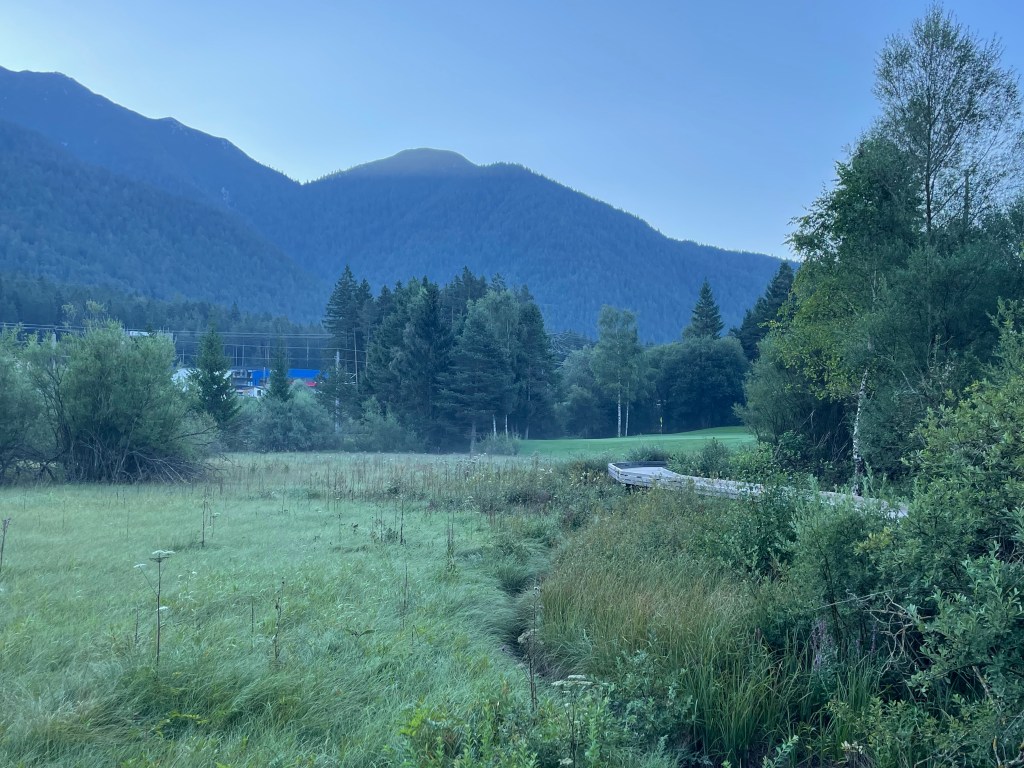 Morgens um 7 in Seefeld. Außer mir sind an diesem Augusttag, der wieder über 30 Grad bringen soll, nur Hundebesitzer:innen unterwegs. Ich habe 7:20 Uhr gebucht und spiele ganz allein, wie ich das frühmorgens gerne mache. Das Clubhaus hat noch geschlossen, klar, aber auf dem Platz ist bereits jede Menge los. Ich warte artig meine Teetime ab, aber so genau nimmt man das hier wohl nicht, vor mir drängen sich einzelspielende Einheimische noch hektisch auf den Abschlag. Was soll’s, ich bin im Urlaub. Die Sonne ist noch nicht über den Seefeldspitz im Osten des Platzes gekommen, Seefeld liegt im kühlen Schatten, was die „Düsternis“ der ersten Fotos erklärt.