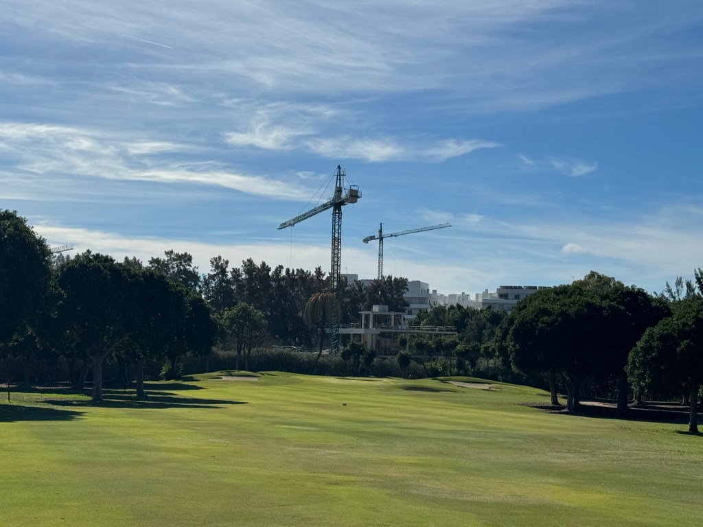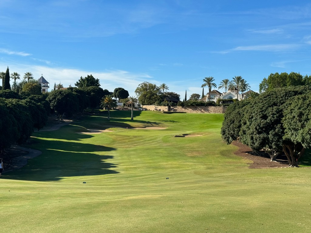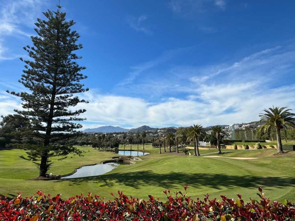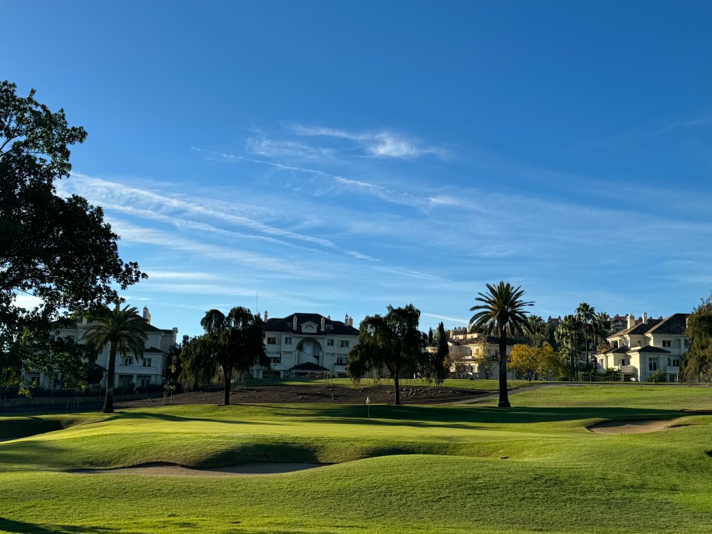 Dafür werden die Bahnen länger und die Grüns bleiben giftig. Jede Menge Palmen, die manchmal ebenso wie die namensgebenden Orangenbäume im Weg stehen, jetzt um die Mittagszeit aber auch wohltuenden Schatten spenden (Mitte November!). Trotzdem sind die Fairways sehr breit und wohl die einzigen ebenen Bahnen rund um Marbella. Langweilig sind sie, wie manche Bewertungen im Internet vermuten lassen, aber keinesfalls, dafür sorgen strategisch gut platzierte Bunker und nach wie vor die glatten Grüns, die kaum einen Break annehmen. Leider ist es zuweilen laut auf dem Platz. Überall in den Hügeln von Marbella wird intensiv gebaut – auch hinter dem Grün der 13 fahren Bagger und Planierraupen und beschallen einen Teil des Kurses. Mit der 14 haben wir die schwierigste Bahn vor uns, die mit 500/430 Metern aber eigentlich nur sehr lang ist. Knifflig wird das rundum bunkerbewehrte Par 3 der 17, optisch sehr ansprechend mit einer hübschen Palmenreihe dahinter. So richtig spektakulär dann die 18, die breit, aber nach links hängend und um die Ecke Richtung Clubhaus verläuft. Eine kleine Brücke über einen winzigen Bach davor und ein klitzekleiner Teich vor dem höherliegenden Grün. Ich habe heute noch keinen Ball verloren, bis jetzt, noch dazu vor der vollbesetzten Clubhausterrasse… Dort sitzen wir dann, studieren die Speisekarte und freuen uns, dass man hier sogar einen „Radler“ kennt, auch mein Lieblingsgetränk nach einer heißen Golfrunde.