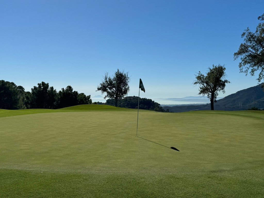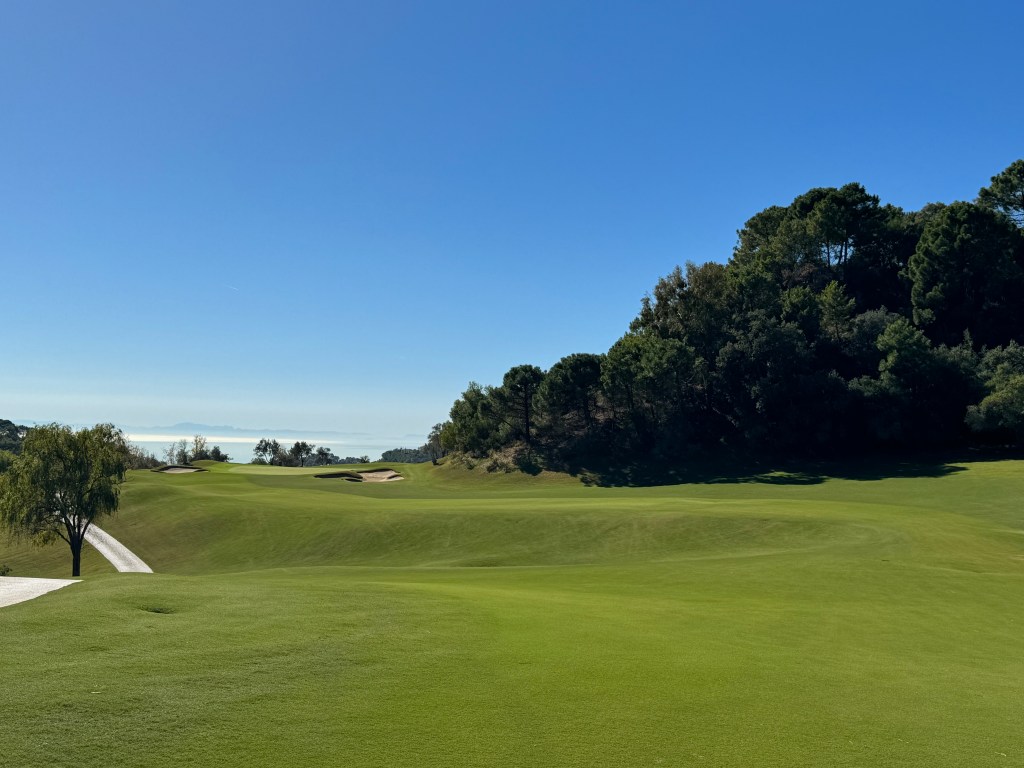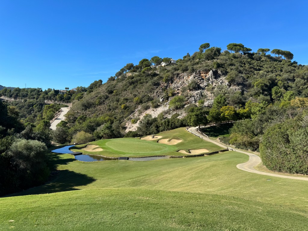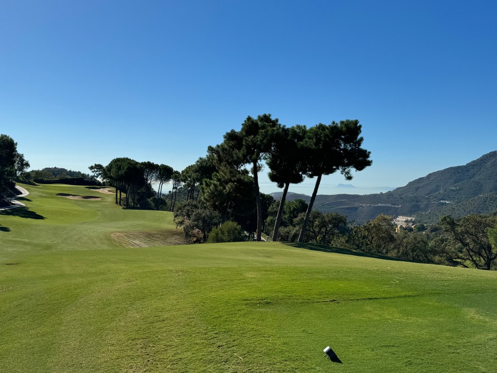 Wunderschön anzusehen die 6 mit einer alten Pinie, ausgerechnet in der Mitte, das Grün schwierig anzuspielen, wenn man nicht genau weiß, wo. Am Tee der 7 halte ich erst einmal den Atem an, einerseits, weil die Bahn wunderschön vor uns liegt, anderersseits, weil rechts neben der Pinienreihe der Blick gen Gibraltar atemberaubend ist. Maria und ihr Mann waren unter den ersten, die in den 1980er-Jahren in La Zagaleta gebaut haben. Ab und zu deutet sie auf eine der Villen und nennt unbeeindruckt deren beeindruckende Besitzer:innen. Noch mehr aber beeindruckt mich der Patz! Wie akkurat die Ränder der Fairways, wie dicht der Rasen ohne jeden Makel, wie weiß und fluffig der Bunkersand und wie eindrucksvoll geschwungen die Bunkerkanten! Die Grüns nicht allzu groß, aber onduliert und allesamt pfeilschnell. Pflegeintensiv, sehr pflegeintensiv das alles. Die 8 führt hinauf, Richtung Clubhaus samt Heliport (!), und auf der 9 passieren wir den Teich, den ich von der Terrasse aus schon gesehen habe. Das Grün ist bunkerbewacht und ich lerne nun auch den feinen Sand kennen, der bis jetzt unberührt unter meinem Wedge liegt.