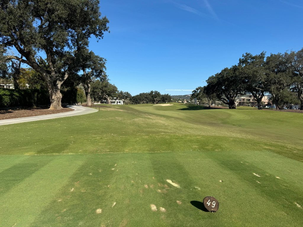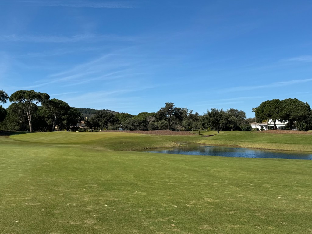 Breit liegen die ersten Fairways am Tee vor mir, rechts und links gesäumt von Korkeichen. Das Par 5 der 1 als Dogleg zum Aufwärmen, dafür dann anschließend gleich für die Herren die schwierigste Bahn des Kurses, ein sehr schönes Par 4, das an einem kleinen, ondulierten Grün neben einem Teich endet. Fast malerisch liegt dann die 3 vor mir, anfangs höchst eng, später breiter und das Grün sehr, sehr groß und so richtig schnell, dass meine Putts öfter deutlich zu lang ausfallen.