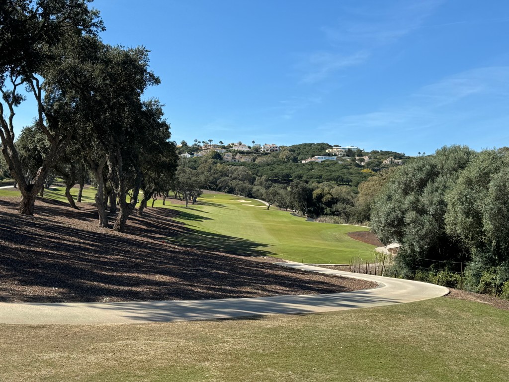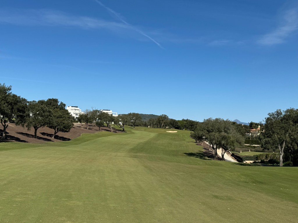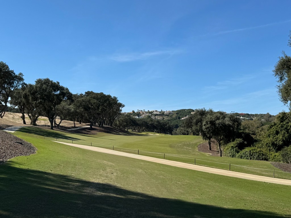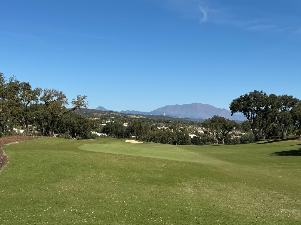 San Roque ist nicht an allen Stellen von den üblichen Villen umgeben, zuweilen wähnt man sich mitten im Wald und würde die erholsame Stille genießen, müsste man nicht alles Augenmerk auf das Spiel lenken. Fantastisch die 4! Erst bergab ins Dogleg, dann wird das Fairway sehr schräg, du hältst dich besser links. Himmelwärts führt dafür das Par 3 der 5, die Pinie oben als Anhaltspunkt, wenn man links davon das Grün treffen will. Prachtvoll liegt dann die 6 vor mir, und wenn man den genau mittig platzierten Bunker mit dem Teeshot einfach auslässt, spielt sich das Dogleg ganz wunderbar. Hohes Rough gibt es am ganzen Kurs gar nicht – im feinsäuberlichen Rindenmulch neben den Teppichfairways will man aber auch nicht wirklich landen. Die Bahn endet auf einem herrlichen Grün, eingebettet in sanftwelliges Drumherum, das einem nur dann nicht gefällt, wenn der Schlag zu lang war und bergab gechippt werden muss…