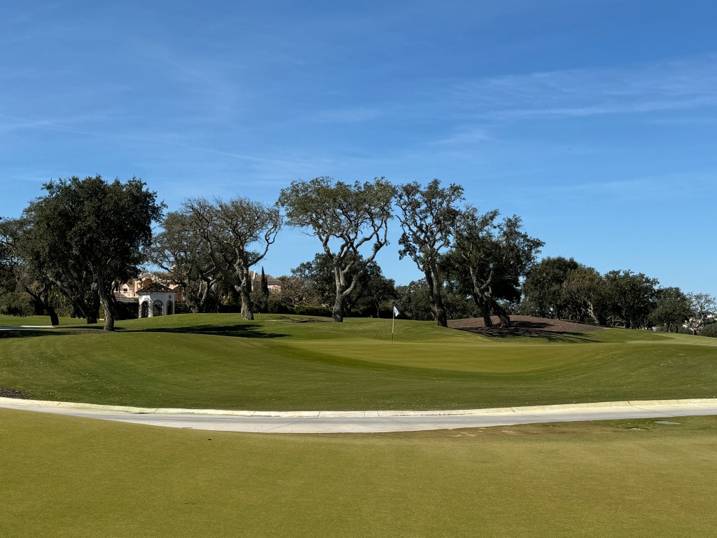 Die Back Nine zeigen deutlich mehr Höhenunterschiede. Die 11 nach einer Kuppe steil runter aufs Grün, das Par 3 der 12 ebenso steil und von der Länge her sehr unterschiedlich, ob von Gelb (130 Neter) oder von Rot (92 Meter). Auf jeden Fall das Grün über links anspielen ;-). Erstmals – und das ist in der Gegend eher selten – kommen jetzt ein paar gegenläufige, terrassenförmig angelegte Bahnen und siehe da, ab und zu tönt ein „Fore“ an mein Ohr. Als doch jemand vor mir unterwegs! Ich genieße die sanft gewellten Fairways, was ihr Aussehen betrifft, achte aber trotz Begeisterung tunlichst darauf, ihre (seitlichen) Neigungen nicht zu übersehen. Die Bahnen verlaufen leicht ansteigend hinauf, ehe man das Plateau der 18 erreicht. Das sonnige Par 4 – die Bäume in gebührende Entfernung – führt in einem leichten Bogen Richtung Clubhaus. Den Bunker vor dem Grün rechts lasse ich aus, schlage aber deshalb zu weit und der Ball rollt konsequent links das schnelle, steile Grün (Foto!!!) hinunter, genau Richtung Terrasse. Gefühlte hundert Augenpaare im Rücken bleibt mein Chip zu kurz und der Ball rollt unweigerlich wieder herunter. Sagen wir so: Die 18 war nicht mein bestes Loch an diesem Tag.