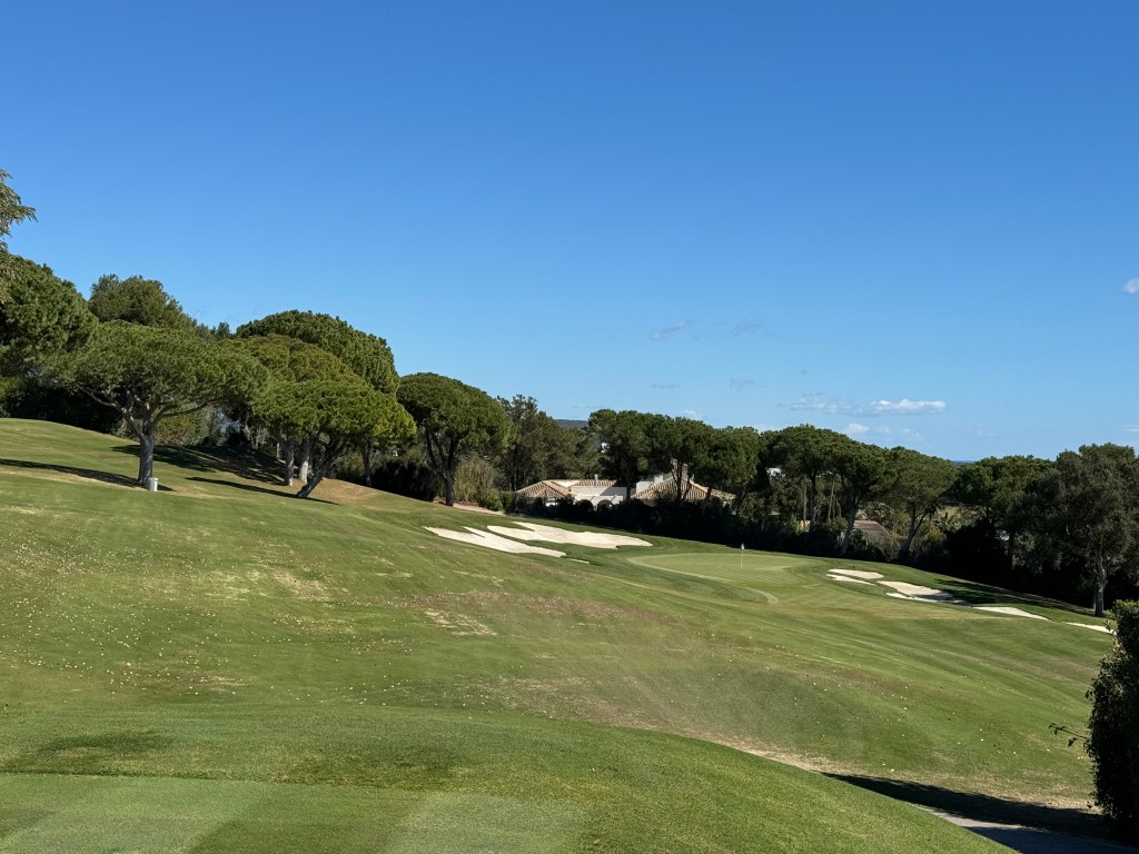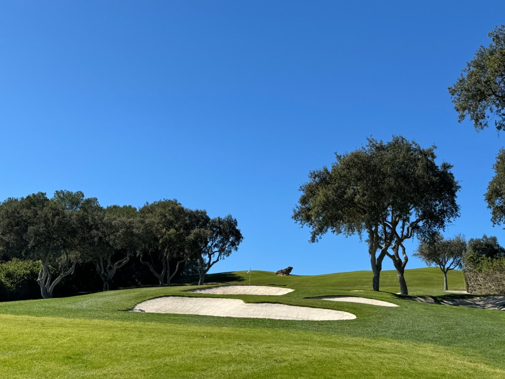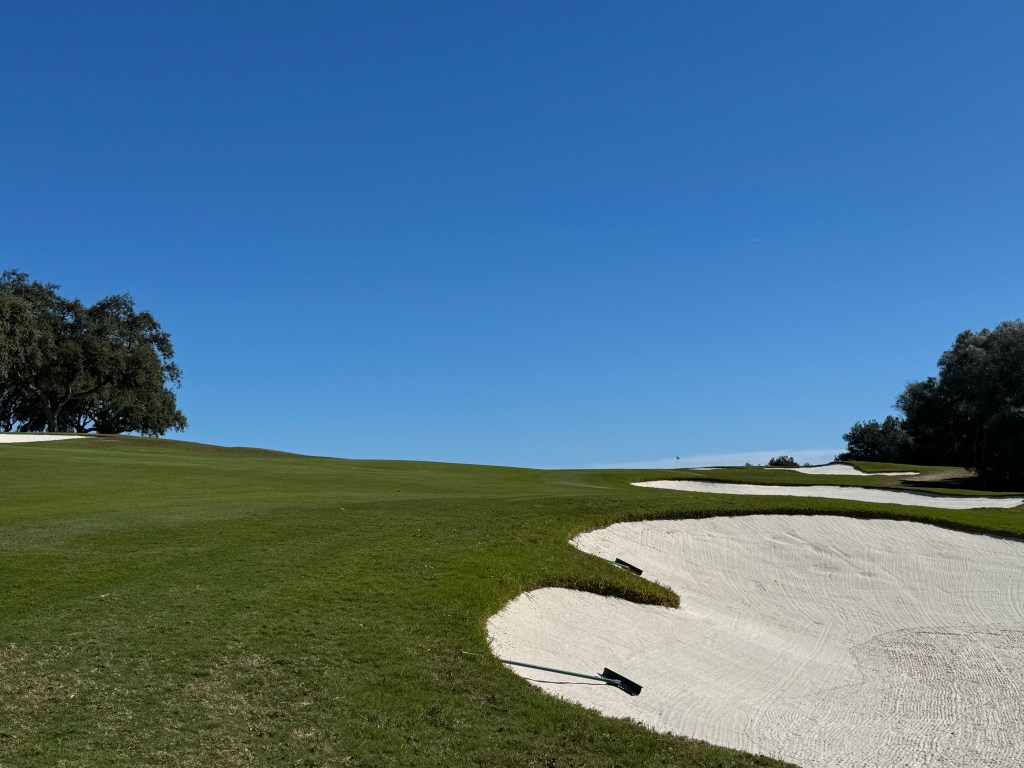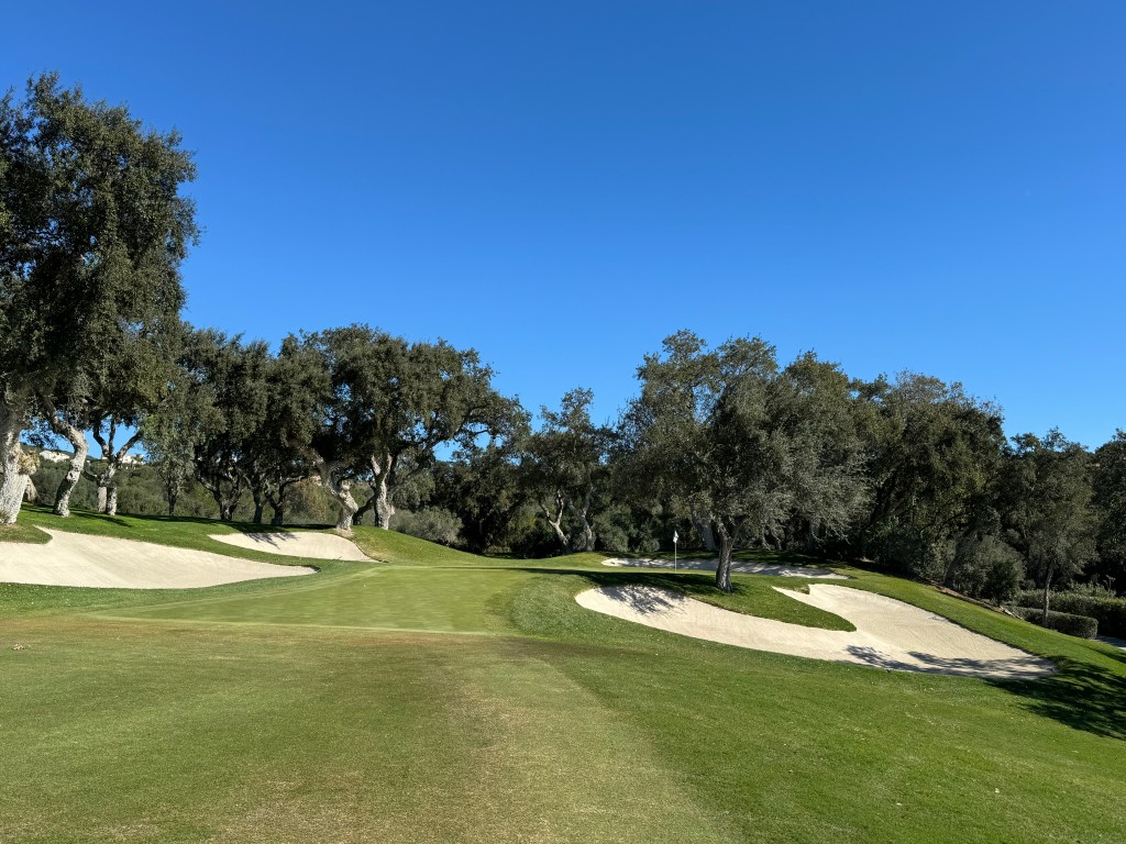 Das Par 5 der 4 beginnt ausreichend breit, verläuft später aber bergauf und endet auf einem kleinen Grün, links Riesenbunker, rechts Wasser. Und überhaupt Grün: ich hatte „sehr schnell“ erwartet und bekam es auch. Putten ist im Royal Club Valderrama eine Herausforderung, auch wegen der unscheinbaren, schwer zu lesenden Breaks. Vom Damentee aus setzt man dann auf der 5 den Ball mittig zwischen die Bunker, ehe es steil bergan geht, auf ein wirklich traumhaft schönes Grün! Die Schneise dorthin ist schmal und vier Bunker rund ums Grün machen die Sache nicht einfacher.