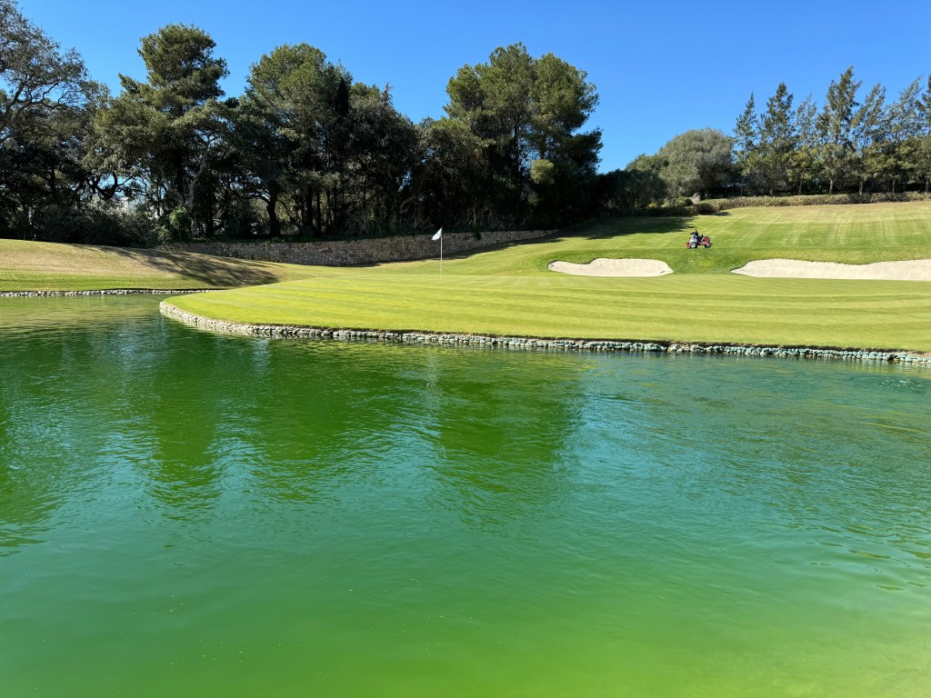 Die 10 führt uns als Dogleg um einen Teich und sanft hügelan und dann – stehen wir am Tee der 11, die ewig lang, bergauf und mit seitlichen weißen Bunkerketten vor uns liegt. Scheinbar direkt in den Himmel führt die Bahn, die man aus dem Fernsehen so gut kennt, und wo der starke Wind den Profispielern den Teeshot aus großer Distanz so schwer macht. Ich spiele weitaus kürzer, aber schöne Schläge und beendet die 11 immerhin mit einem Bogey. Nach dem Putten muss man einfach kurz innehalten und den Ausblick bis zum Meer genießen und auf die Bunkerlandschaft der 15. Doch zuerst liegt schmal, sehr schmal, das lange Par 4 der 12 vor uns. Seitlich vom Grün führt der Weg ins Buschwerk, und Igel zeigt mir den riesigen Speichersee, der erst vor wenigen Jahren angelegt wurde, um das Wasser vor allem für die sommerliche Platzbewässerung zu sammeln. Valderrama wurde übrigens als erster Golfplatz Europas schon 1991 umweltzertifiziert. Auch Plastikflaschen sind verpönt, immer wieder gibt es Trinkwasserautomaten mit Papierbechern.