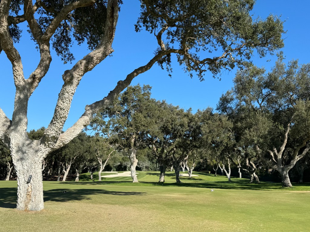 Das Par 4 der 1 steht schon dafür, wie der Par-71-Kurs (mit 5.520/4.874 Metern kürzer als mein Heimatplatz) generell sein wird. Nicht unüberwindlich lang, aber äußerst schmal, rechts und links von hübschen knorrigen Korkeichen gesäumt, die nach dem 1. Schlag im Dogleg der 2 auch die komplette Sicht auf das Grün versperren. (Bitte schau dir das Foto an…!) Dafür punkte ich auf dem schrägen, kurzen Par 3, das wie zur Erholung folgt und merke: Man kann auch in Valderrama durchaus ein Par spielen.