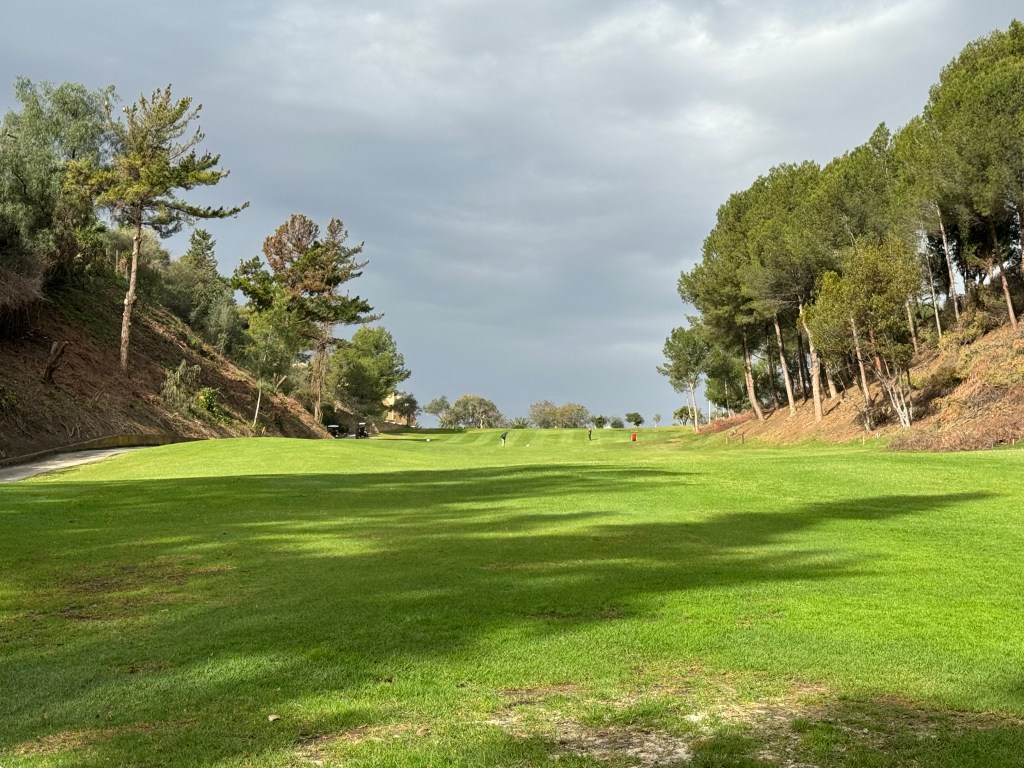 Aber die Längen sind es nicht, die den Par-71-Kurs schwierig machen, man braucht eine gewisse Präzision und zumindest die Idee einer Strategie. Die Downhill-10 hat zumindest eine breitere Landezone, ehe es auf das erhöhte Grün geht, das gemeinerweise fast unsichtbar onduliert ist – für mich zumindest. Nach einem halbwegs ebenen Par 3 fahre ich zum gelben Tee der 13 und von dort ist der Ausblick einfach atemberaubend: Tief unten eines der Signature Holes des Platzes, das Par 4 der 12, schwierig von allen Tees, weil jede Landezone schmal zwischen Pinien liegt. Auf dem Grün wundere ich mich, weil laute spanische Rufe zu mir herüber schallen und jeweils drei der vier Herren des Vorderflights mit dem Rücken zu mir stehen und aufgeregt beobachten. Als ich an der 13 ankomme, wird mir klar, warum. Ist der Teeshot von Rot tief hinunter auf das Fairway schon unübersichtlich, hat man von Gelb einen blinden Schlag und braucht Kumpels, die einem sagen, ob der Ball überhaupt im Spiel ist.