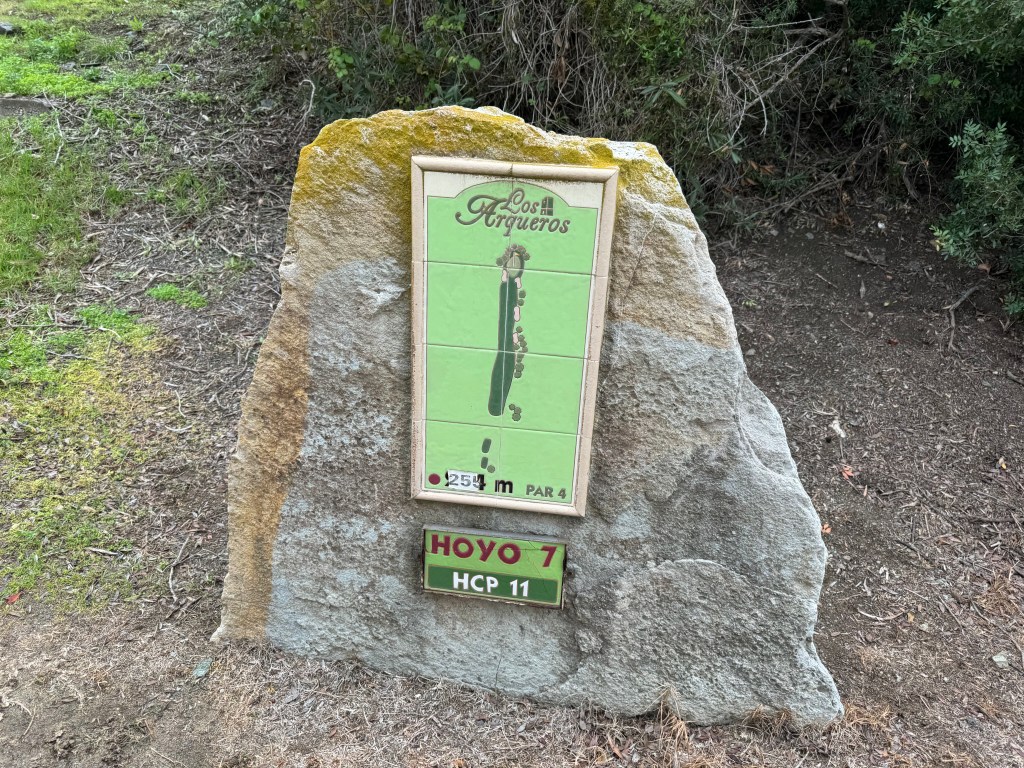 Von den erhöhten Abschlägen spielt man über eine Grube auf das wiederum oben liegende Grün der 5. Wieder ist nicht der Schlag das Problem, sondern das ziemlich schnelle Grün, dessen Breaks ich nur schwer erkennen kann, die aber sehr wohl da sind, ohja. Überhaupt – auch wenn ihr auf den Fotos braune Stellen auf den Fairways seht: Los Arqueros ist in tadellosem Zustand, auch die 7, eine der wenigen ebenen Bahnen, dafür gemein schmal, ich schätze das Fairway etwa auf 30 Meter Breite. Seve lässt uns Spieler:innen keine Zeit zum Verschnaufen: Die 8 mit Hcp 1 ist als Dogleg gestaltet, fällt nach einer Kuppe blind (und steil!) ab zu einem querenden Bachlauf, um anschließend zwischen beidseitigen Bunkern wieder ziemlich anzusteigen Richtung winzigem Grün. Das kurze Par 4 der 9 wird durch den steil ansteigenden Verlauf nicht unbedingt kürzer.