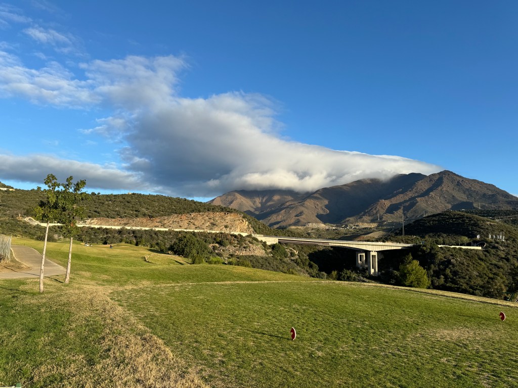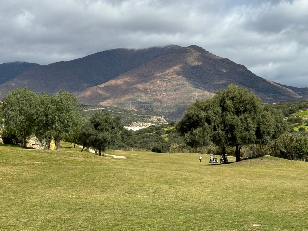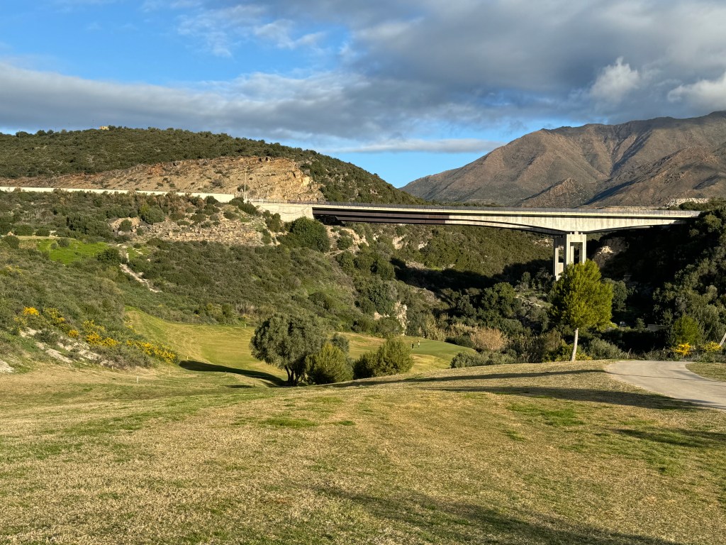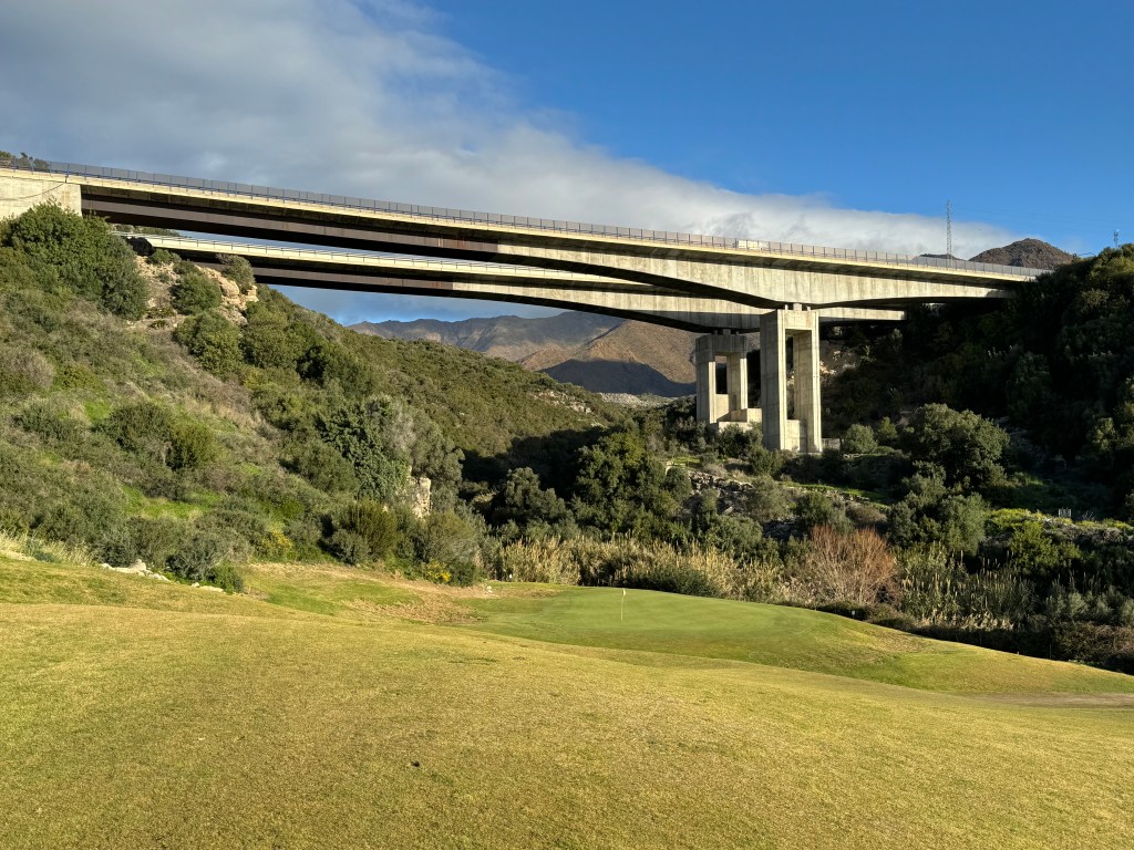 Das französische Paar dort hat keine Teetime, lässt mich aber konsequent alleine los spielen, was von Anfang an keinen Sinn macht, weil vor mir ausschließlich 4er-Flights spielen. Ich bin beeindruckt: Vor mir die Berge der Sierra Bermeja, wolkenumfangen in dramatischem Licht, darunter eine kolossale Autobahnbrücke, und vor mir ein Par 4, auf dem ich mich deutlich links halte. Schwierig, denn der Wind pfeift ordentlich (kalt) aus den Bergen an diesem frühen Märzmorgen. Fast linksgolfartig ist das Fairway auf der 2, mit Wellen und Senken und sehr hartem Boden für langen Roll, den ich gut brauchen kann. Rückenwind diesmal, passt.