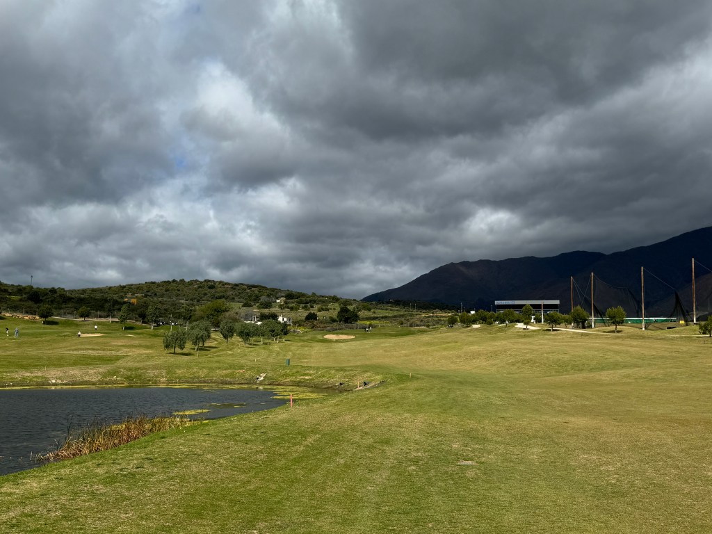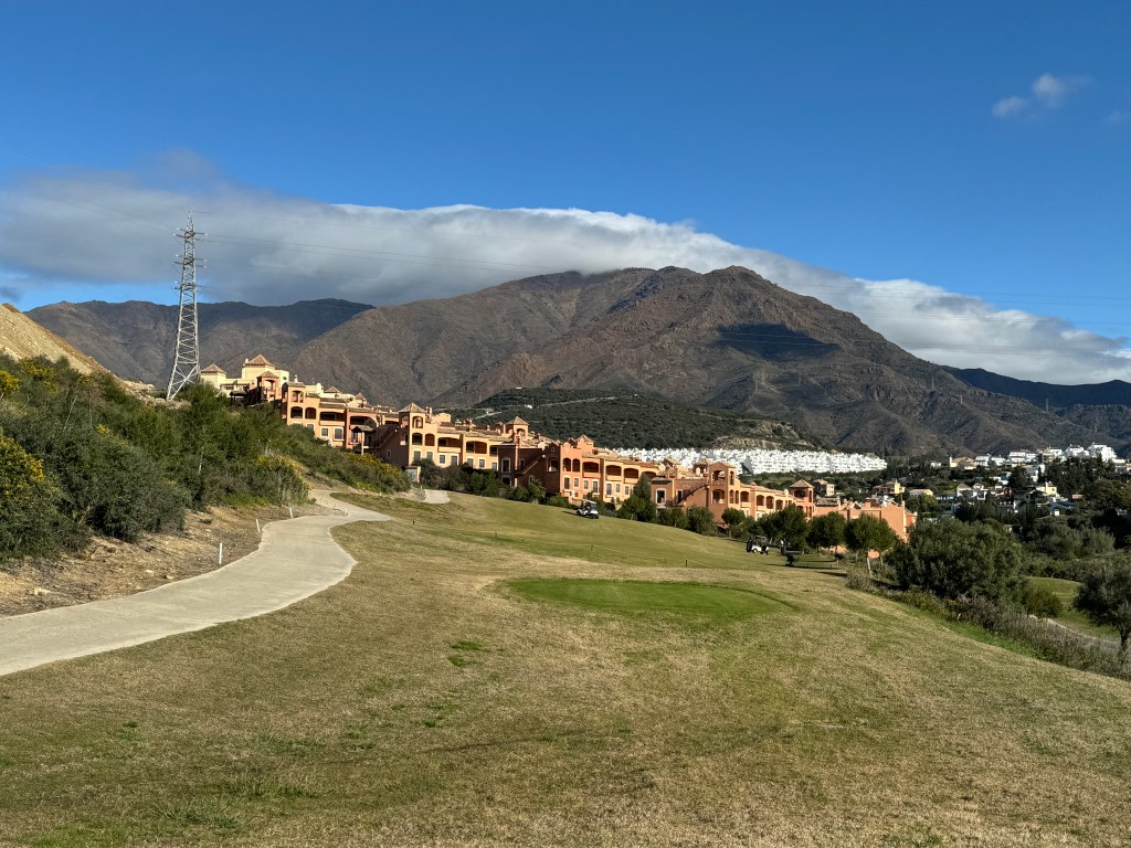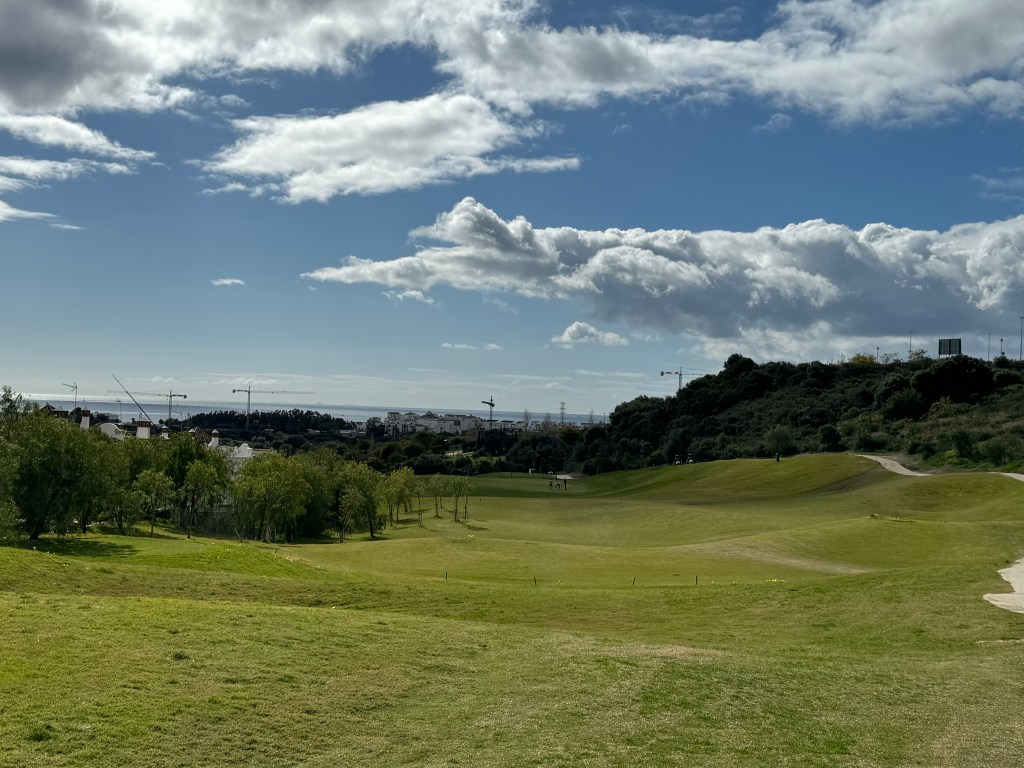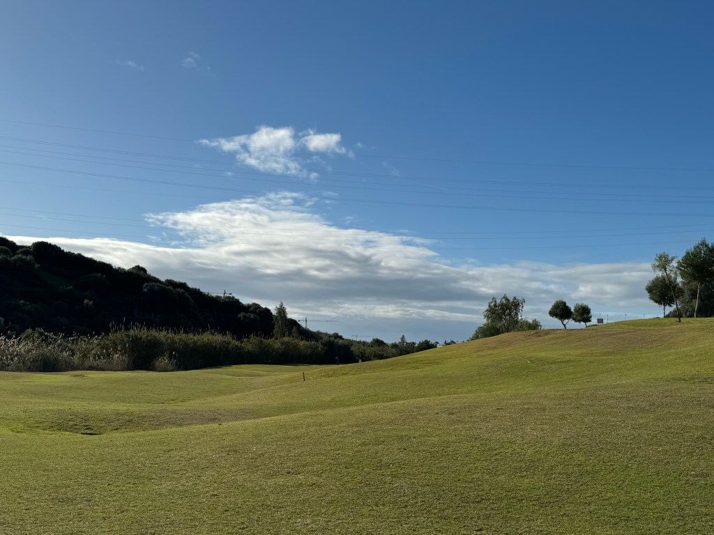 Das französische Paar dort hat keine Teetime, lässt mich aber konsequent alleine los spielen, was von Anfang an keinen Sinn macht, weil vor mir ausschließlich 4er-Flights spielen. Ich bin beeindruckt: Vor mir die Berge der Sierra Bermeja, wolkenumfangen in dramatischem Licht, darunter eine kolossale Autobahnbrücke, und vor mir ein Par 4, auf dem ich mich deutlich links halte. Schwierig, denn der Wind pfeift ordentlich (kalt) aus den Bergen an diesem frühen Märzmorgen. Fast linksgolfartig ist das Fairway auf der 2, mit Wellen und Senken und sehr hartem Boden für langen Roll, den ich gut brauchen kann. Rückenwind diesmal, passt.