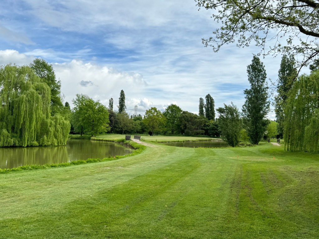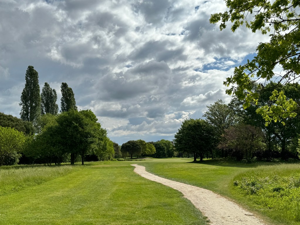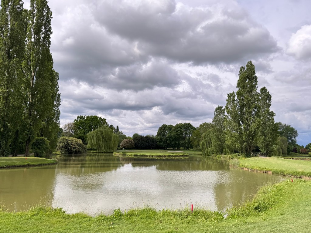 Optisch wunderschön, aber die schwerste Bahn, dann das Par 4 der 6, das in der Mitte durch Teich links und Bunker rechts ganz außerordentlich tailliert ist. Achtung, ich hätte danach fast den falschen Abschlag gewählt: Von der 6 geht es am Tee der 13 vorbei durch die Buschreihe auf die 7. Das Par 3 endet auf einem Dreiviertelinselgrün mit allerliebsten gelben Lilien am Teichrand, die meinen Ball magisch anziehen. Sehr schön zu spielen das leichte Dogleg der 8, ehe mit der 9 ein Par 5 folgt, dessen Fairway außerordentlich weit vom Abschlag entfernt beginnt. Apropos Abschläge: die sind wirklich der einzige Makel heute, das Gras ist so hoch, dass ich zu einem höheren Tee als üblich greifen muss. Anzunehmen, dass der Regen der letzten Wochen das Gras exorbitant sprießen lässt und die Greenkeeper kaum nachkommen. Generell ist der Platz nämlich top in Schuss!