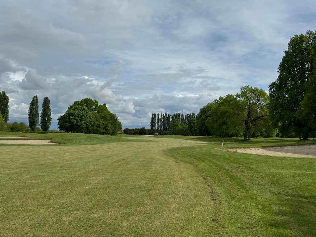 Vor mir liegt, zwischen hohen Baumreihen, das Par 5 der 1, ein sehr akkurat gemähtes Fairway mit weißleuchtenden Bunkern, die ich spielerisch ignoriere. Das mit den Bäumen soll auch auf den nächsten Bahnen so bleiben. Auf der 3 bildet eine hohe Pappelreihe rechts das Aus, das Bermudagras-Fairway zieht sich schlangenlinienförmig durch sanfte seitliche Hügel und Wellen und macht die ansonsten völlig ebene Bahn tricky. Ein Mähroboter kreuzt meinen Weg und hinterlässt ziemliche Mährückstände. Sehr ähnlich anfangs die beiden leicht nach rechts gebogenen Bahnen 4 und 5, die allerdings unterschiedlich enden. Bei der 4 lässt ein Streifen Rough vor dem Grün nicht zu, dass man den Ball hinaufrollen lässt, bei der 5 kommt am Ende ein überraschendes Grün – das wie alle anderen ziemlich schnell ist – rechts vom Teich.