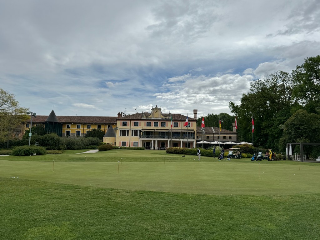Nein, die kurvig-steile Einfahrt in die Tiefgarage am Clubhaus, die sich erst unten als geschlossen erweist, was mich zum mühsamen Zurückschieben zwingt, muss nicht sein. Es gibt einen Parkplatz für Gäste neben dem beeindruckenden, schlossartigen Clubhaus, das – ebenso wie die Ländereien – venezianischen Grafen mit dem melodischen Namen Emo Capodilista gehört hat, die heute für ausgezeichnete Weine bekannt sind. Mein Trolley parkt nobel unter dem Säulenvordach, ich bekomme ohne Mühe eine Startzeit für den Aprilmorgen und die Kombination Weiß/Rot und kann losziehen.