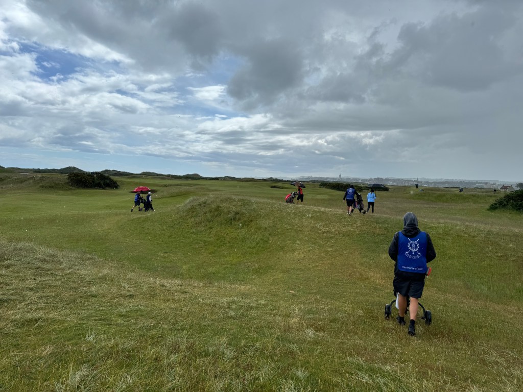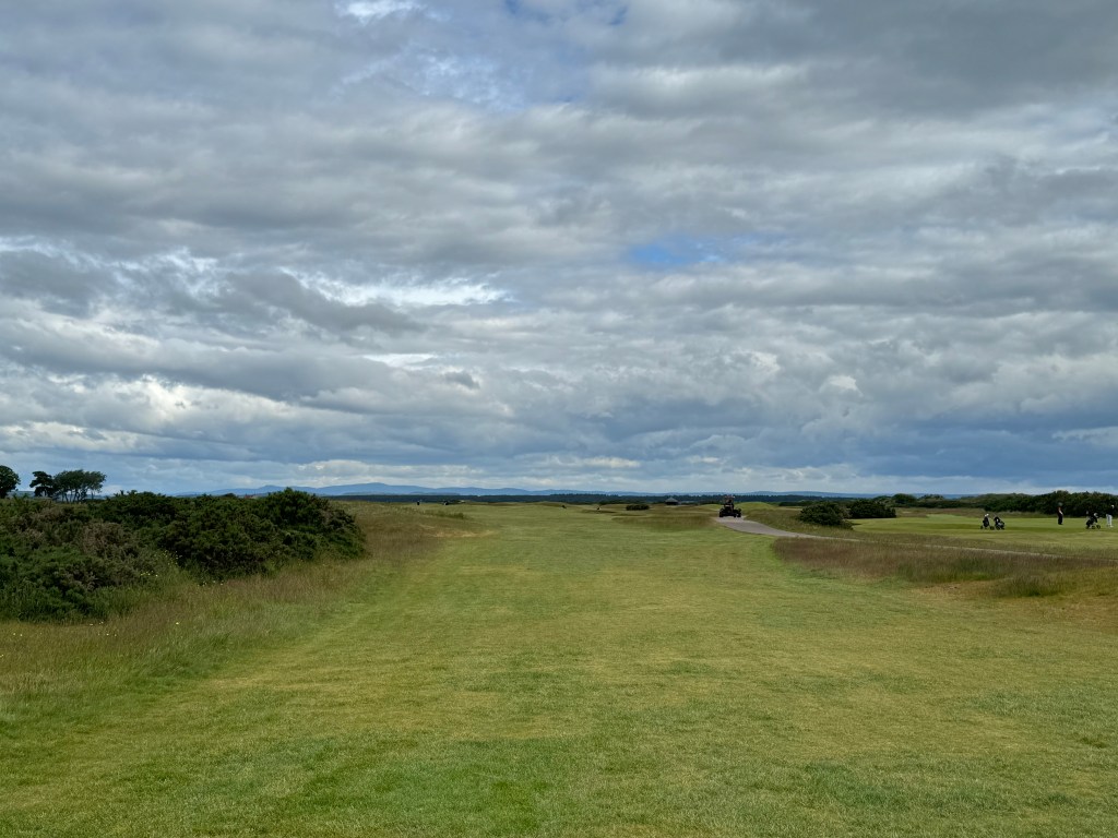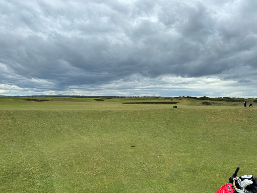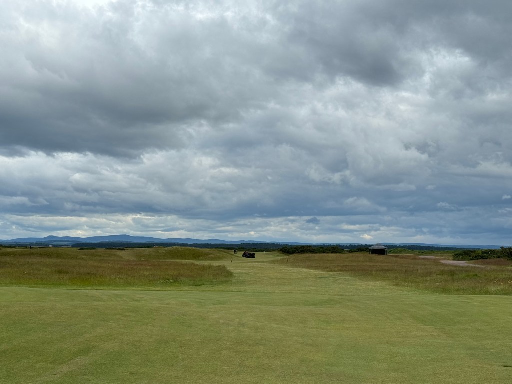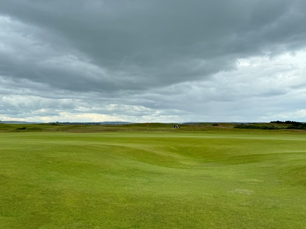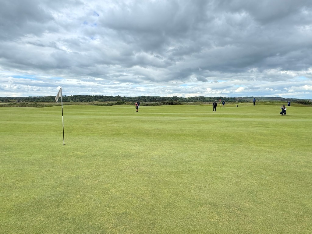Ich merke bald, was in Schottland wohl anders läuft: Niemand geht ordentlich auf Spielhöhe mit dir, nach dem Schlag wird seitlich einfach zum eigenen Ball weitergelaufen. Gewöhnungsbedürftig für Festlandeuropäer:innen, denen man immer eingetrichtert hat, man möge schon aus Sicherheitsgründen nicht vor einen Spielenden laufen. Und: Es ist sehr viel Bewegung drin, wenn sieben Leuten auf der Runde sind. Bist du auf dem Grün, drückt dir der Caddie den Putter in die Hand und liest dann von mehreren Seiten die Puttlinie. Empfehlungen beherzigen – die zuweilen starken Wellen auf den Grüns, aber auch unsichtbares Uphill oder Downhill benötigen gute Planung! Und auf den Doppelgrüns ist was los, aber hallo! Zuweilen halten sich zwei Gruppen dort auf, macht im Höchstfall 16 (!) Personen. Geputtet wird aber ganz relaxed, verzieht man einmal den Annäherungsschlag zur falschen Fahne wie ich, darf man ohne schlechtes Gewissen den 50-Meter(!)-Putt zur richtigen machen: niemand regt sich auf, man lässt höflich den Vortritt. So gelingt mein langer Putt recht gut und braucht nur einen Folgeputt ins Loch.