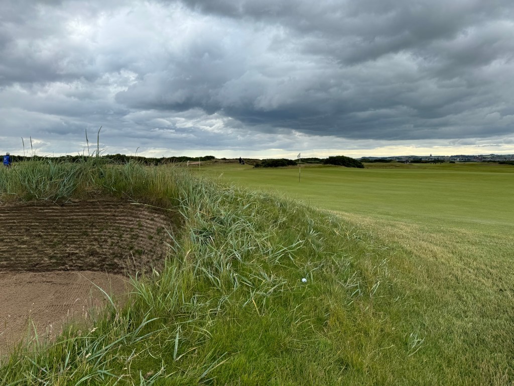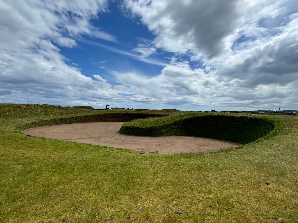 Der Regen macht mein Spiel nicht unbedingt leichter, dafür bin ich jetzt innerlich ruhig und habe mich an das erhöhte Personenaufkommen beim Spielen gewöhnt. Auch an den Amerikaner, der spielt, als wäre er allein auf dem Platz, dabei aber sehr freundlich ist. Seine Verhandlungen mit dem Caddie dauern am Tee oder am Grün minutenlang („Uphill!“ – „No, it’s downhill, believe me.“) Susanne achtet aber penibel auf unsere Spielgeschwindigkeit. Langsam sein ist ein No Go. Ohne Caddie-Anweisungen täte ich mir schwer. Praktisch hinter jeder Welle, hinter jedem Grasbüschel lauern tiefe Bunker – 124 insgesamt. Das Problem: Man sieht sie fast nie, sieht man von den Topfbunkern um die Grüns herum ab, aus denen das Herauskommen wirklich schwierig, aber immerhin machbar ist. Seitlich oder sogar gegen die Spielrichtung herausspielen wird dringend empfohlen. Das kostet ein bisschen Stolz, spart aber Bunkerschläge gegen die Steilwand.
