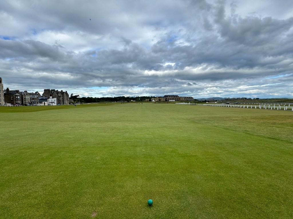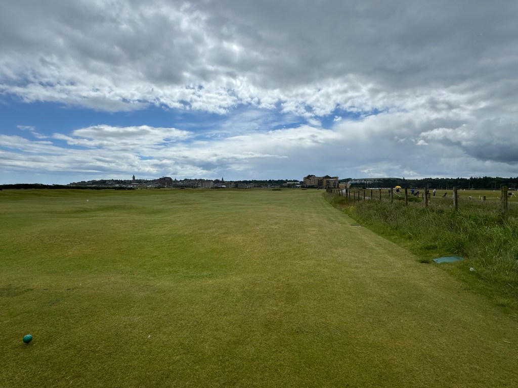 Der erste Blick auf den Platz. Die 1 vom grünen Tee: ein Fairway für die 1 (rechts, dort stehen bei den Open immer die Tribünen) und die 18 gemeinsam