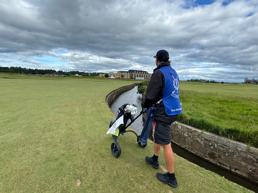 Das Fairway liegt breit vor uns – eigentlich sind es zwei: links die 18, rechts die 1. Irgendwo wird mein Ball da schon landen, hoffe ich, und mein 1. Abschlag ist dann auch recht passabel. Mitten durch das Fairway führt eine kleine Straße – Spaziergänger mit Hunden auf dem Weg zum benachbarten Strand und Autos nehmen Rücksicht auf die Spieler, ehe sie queren. Auch das ist Schottland: Man ist höflich und achtsam. Immer. Durch die 1 schlängelt sich das einzige Wasserhindernis des Platzes, der Swilcan Burn, mal längs, mal quer vor dem Grün. Ein schmaler Kanal nur, allerdings bällefressend, wenn man so nervös ist wie ich. Tom fischt gekonnt meinen Ball aus dem Wasser, der eigentlich auf dem Grün hätte landen sollen. Das Grün ist eines der wenigen auf dem Platz, das kein Doppelgrün ist, sauschnell und mit Breaks, die nur das Caddieauge erkennt.