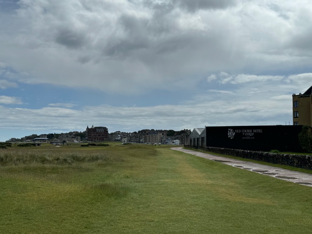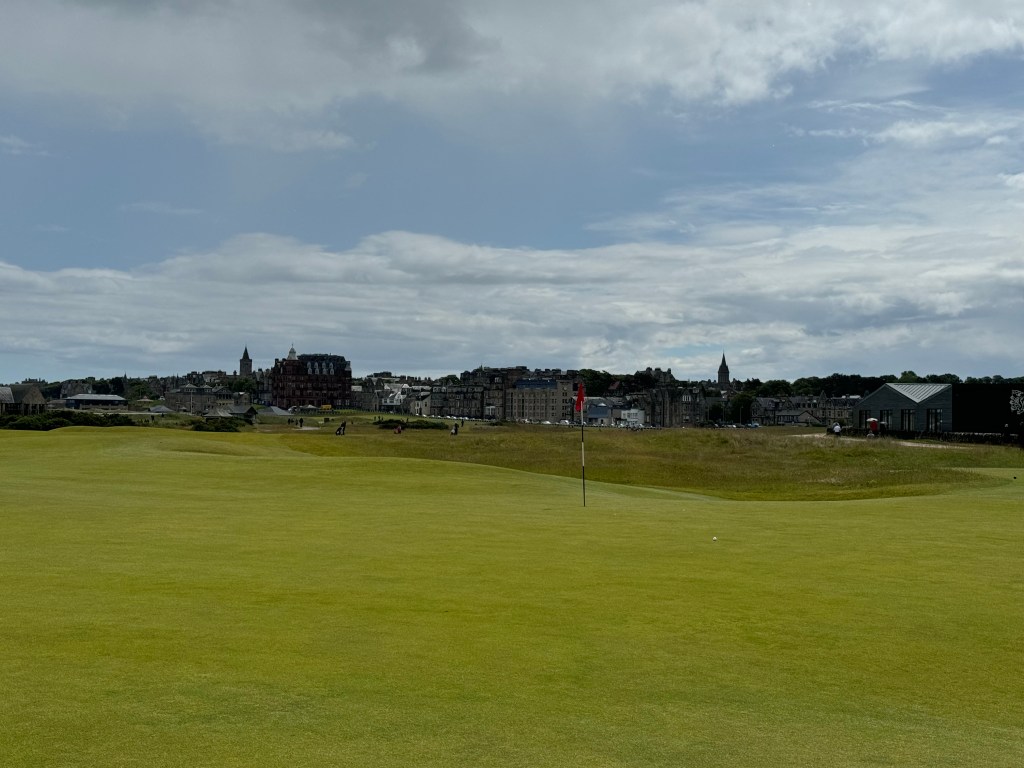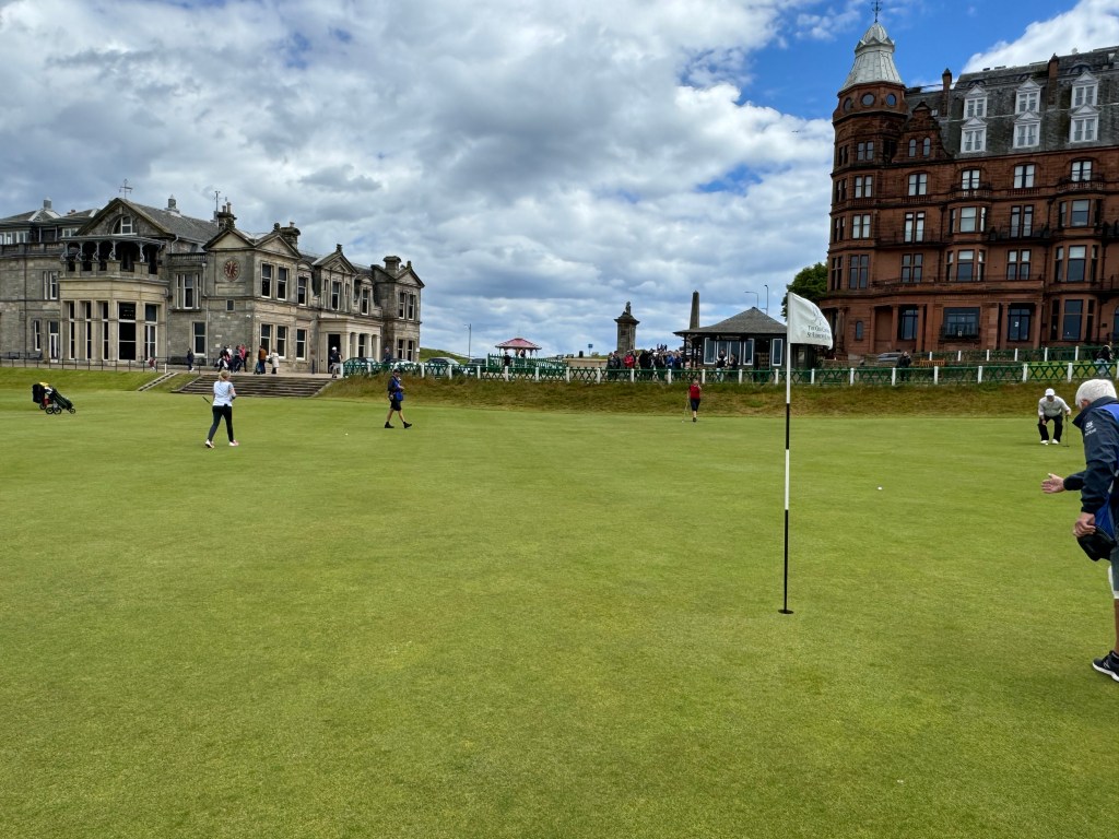Und dann geht es endgültig die 18 zurück, in mir macht sich so etwas wie Euphorie breit. Das ist der berühmte Anblick, den man hunderte Male auf Fotos und im Fernsehen gehabt hat. Das Aus rechts ist ein weißer Holzzaun zur Straße, und dort parken erstaunlicher Weise Autos. Mir gelingt ein schöner hoher Schlag auf das Grün, die Menschen hinter der Begrenzungsmauer zur Straße applaudieren. (Von dort aus lässt es sich übrigens wunderbar über die hereinkommenden Gruppen lästern, ich sag’s nur 😉 Noch einmal lesen unsere Caddies die Puttlinien, und dann ist sie geschafft: die Runde auf dem Old Course.