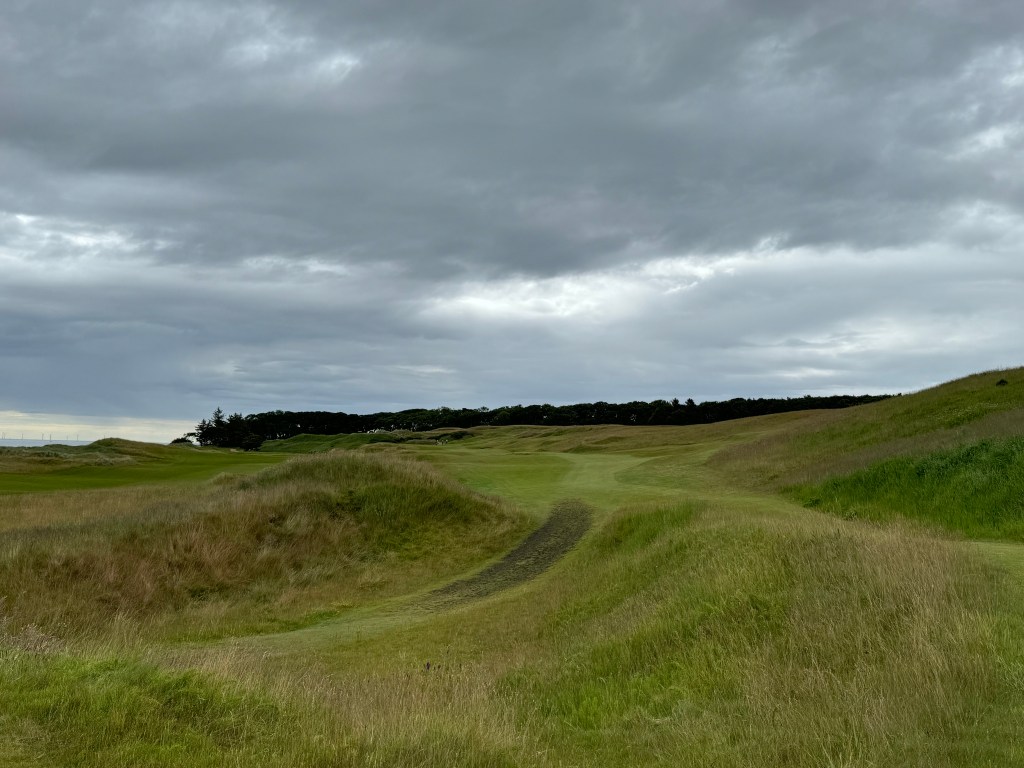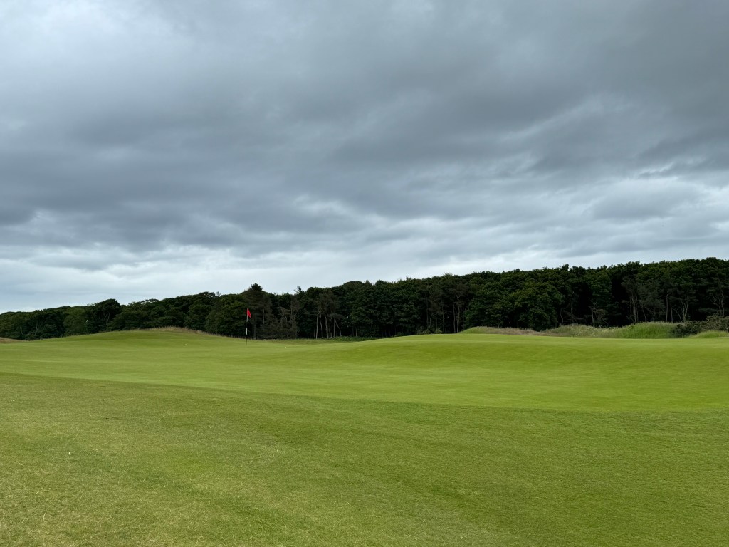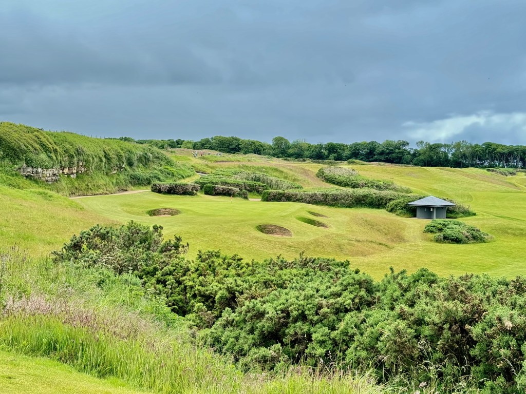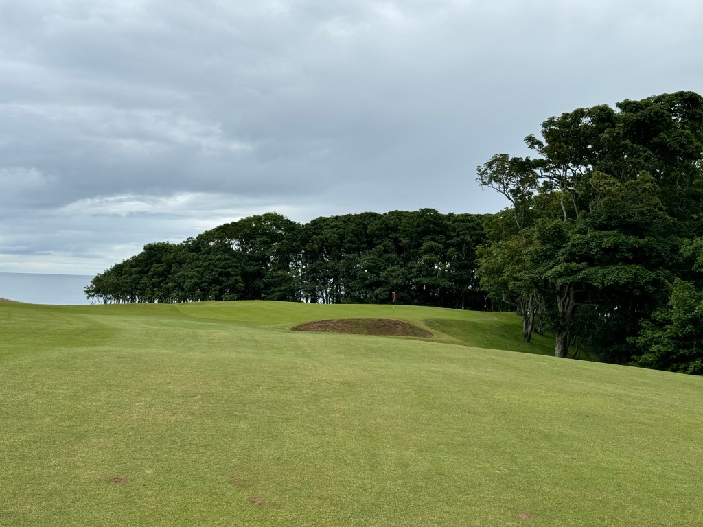 Wie es sich gehört, führt die 9 zurück zum Clubhaus, es gibt aber eine Halfway mit (heißen) Getränken und der landesüblichen warmen Suppe. Rechts halten auf der 10, deren riesiges Grün leicht erhöht liegt und stark onduliert ist. Und schnell wie alle anderen natürlich. Die 11 führt in leichtem Bogen tatsächlich an einem Wäldchen entlang, einer Rarität auf schottischen Links. Zu weit rechts ist ein Dilemma, weil der Ball unweigerlich den steilen Abhang hinunterrollt. Dafür ist das Grün hoch oben. Durch den Wald geht es zum Tee der 12 und wenn du dort ankommst: erst einmal stehen bleiben und genießen! Links rauscht das Meer, unter und vor dir herrliche, grüne Fairwaywellen mit Linkskurve. Wind beachten und „abkürzen auf der Meerseite ist keine gute Idee“, sagt Holger. Nach einem kurzen Abwärts-Par-3 auf ein Grün, das man vor lauter Topfbunkern rundum kaum wahrnimmt, führt die 14 breit zurück. Ein Halbinselgrün spielt man auf der 15 an, wieder ein Par 3. Links Richtung Grünbunker halten – der Ball rollt abwärts Richtung Wasser zur Fahne, sagt Holger und behält wie immer Recht.