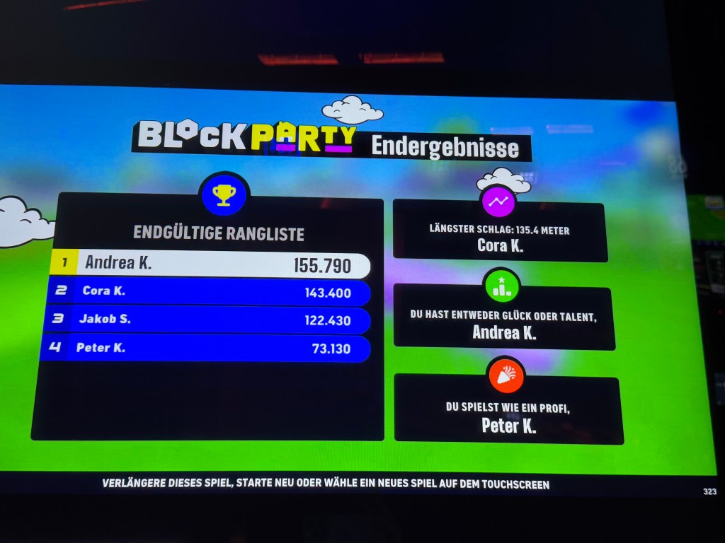Wir wechseln zum Zielschießen bei „Block Party“, später dann zu „Top Shot“, weil uns nach der ganzen Präzisionsarbeit endlich nach Weite ist. Tochter und Freund dreschen ihre Bälle erfolgreich Richtung Netz, mein Mann hält sich wacker und trifft die naheliegenden Zielscheiben, was ihm ebenfalls Punkte beschert. Auf den Monitoren sprühen nur so die Gewinn-Funken, am Ende hat jeder von uns irgendwie ein Spiel gewonnen. Und: Es hat uns Allen tatsächlich Spaß gemacht!