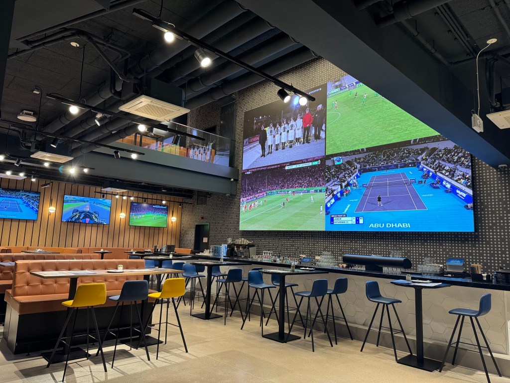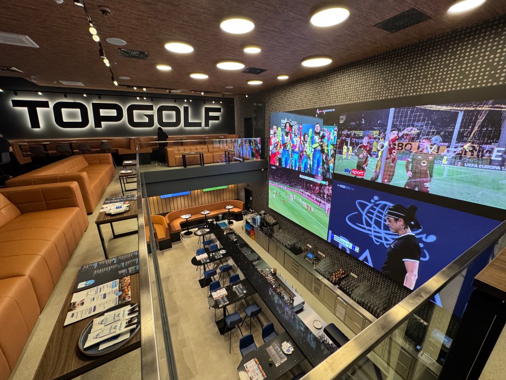 Topgolf ist KEINE Range und KEINE Trainingsmöglichkeit. Topgolf ist etwas für eine nette Runde aus Golfer:innen und/oder Nichtgolfer:innen, die gemeinsam ein paar fröhliche Stunden verbringt. Die Bays sind für max. sechs Personen ausgelegt und können stundenweise gemietet werden. (Als Kundenwunsch „Lounge“ angeben, dann bekommst du vielleicht die gemütlichere Variante mit Couch statt Barhockern!) Golfschläger sind vorhanden, auch für Linkshänder:innen und Kinder. Vormittags wochentags ist günstiger als zB. Samstagabend. Abgerechnet werden Spiel und Konsumationen am Schluss pro Bay. Wer erstmals spielt, bezahlt außerdem € 6,- Topgolf-Mitgliedschaft. Dafür könne man auf Anlagen in Dubai spielen und in Las Vegas, erklärt man uns, was wir nicht vorhaben, aber gut. Die Gastronomie ist typisch amerikanisch. Essen kann man in der Bay oder in einer der SportBars im Erdgeschoss oder im 1. Stock. Im Sommer wahrscheinlich auch auf den Terrassen.