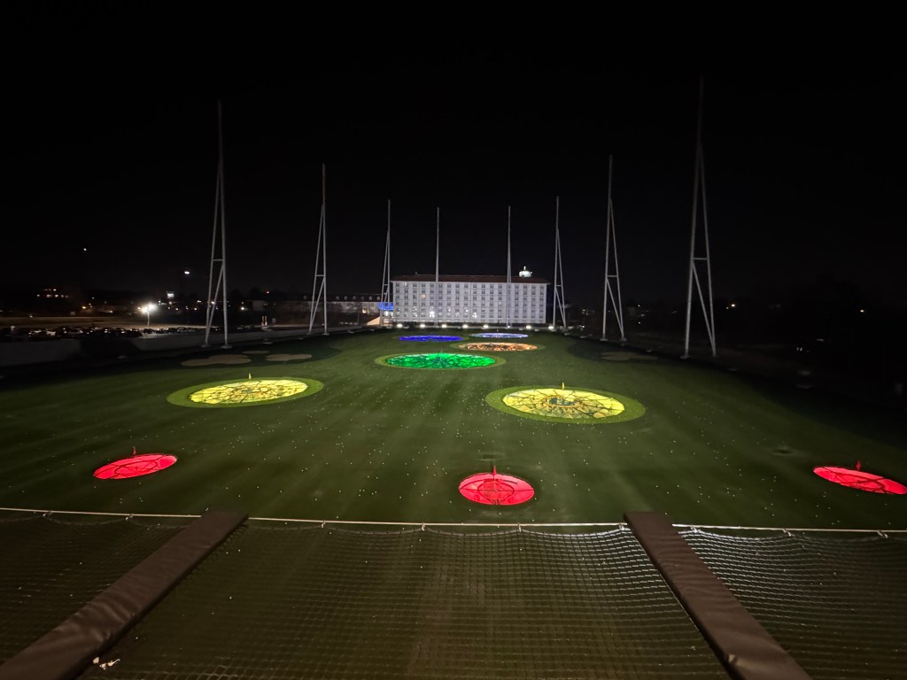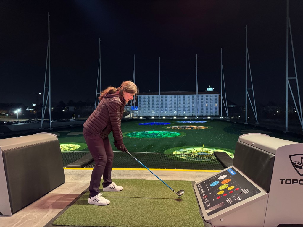 So richtig gut wird die Laune aber, als wir nach unzähligen Schweinen, Vögeln und Kühen endlich in den Spielmodus „Virtual Courses“ schalten. Gleich mehrere Bays spielen jetzt selig die ersten Bahnen von Pebble Beach. Jaaa, DAMIT können wir Golfer:innen was anfangen! Mit Fairways, Bäumen, Wasser und Bunkern auf dem Bildschirm. Das kennen wir vom Indoor Golf, nur hat man bei Topgolf außer den Messdaten den Response deutlicher, weil der Ball tatsächlich fliegt. Und man bewegt sich an der berühmten frischen Luft, die gegen Abend hin noch etwas frischer wird. Aber Wärmelampen.