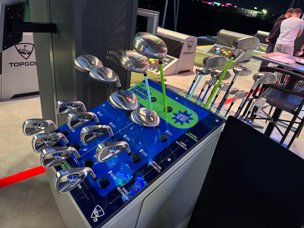 Wir bekommen eine Einweisung, die sich hauptsächlich auf den Check-in und die Bedienung des Monitors bezieht. Schläger stecken griffbereit daneben, links für Herren, rechts für Damen. Ich erkundige mich noch nach der Technik hinter dem ganzen Zauber. Einfach erklärt: Die Bälle sind mit Chips versehen, die in den Ziel-Gruben von mehreren Sensoren erfasst werden. Gemeinsam mit dem Toptracer-System, das wir von den blauen Bögen bei Golfübertragungen kennen, berechnet der Computer Ballflug, Ballgeschwindigkeit, Länge etc. Wir brauchen nur lässig mit dem Schlägerkopf auf den roten Sensor am Ballautomaten zu tippen, und schon kullert ein Golfball vor die Füße. Los geht’s!