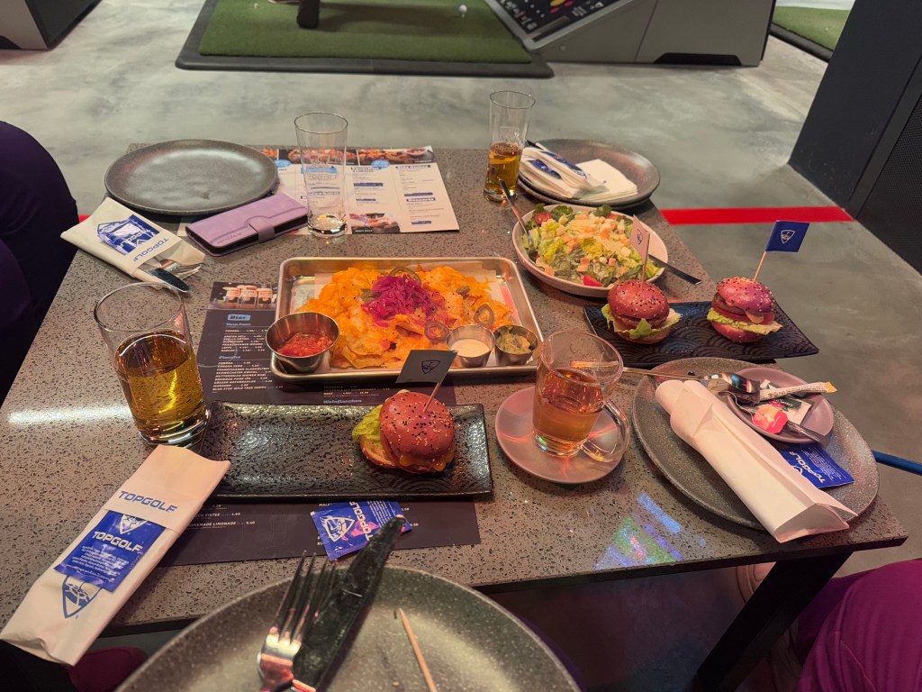Wir probieren alle mal eine Weile herum, gewöhnen uns an die Schläger, ehe wir uns mit „Angry Birds“ das erste Spiel aussuchen. Es gilt, bunte Vögel in Gebäuden abzuschießen, die man sämtlich natürlich nur auf dem Monitor sieht. Die Fläche unter uns liegt weiterhin still da, mit mehreren beleuchteten verschiedenfarbigen Zielringen im Boden. Ich schlage mit dem 3er-Holz Richtung grünem Ring, auf dem Monitor stürzt eine ganze Burg in sich zusammen und ich kassiere 24.800 Punkte. Ich nippe erfreut an meinem Gin Tonic, den wir wie die Softdrinks und den Kaffee beim praktisch allgegenwärtigen Personal geordert haben. Besteck und Servietten sind auf dem Tisch. Zwischen den Spielzügen ist genügend Zeit, Pommes, kleine Burger, Cesars Salad und anderes American Food zu verzehren. Schließlich hat jeder jeweils fünf Schläge am Stück zu absolvieren, da wartet man zwischendurch schon eine kleine Weile, bis man wieder an der Reihe ist. Schlaues Konzept.