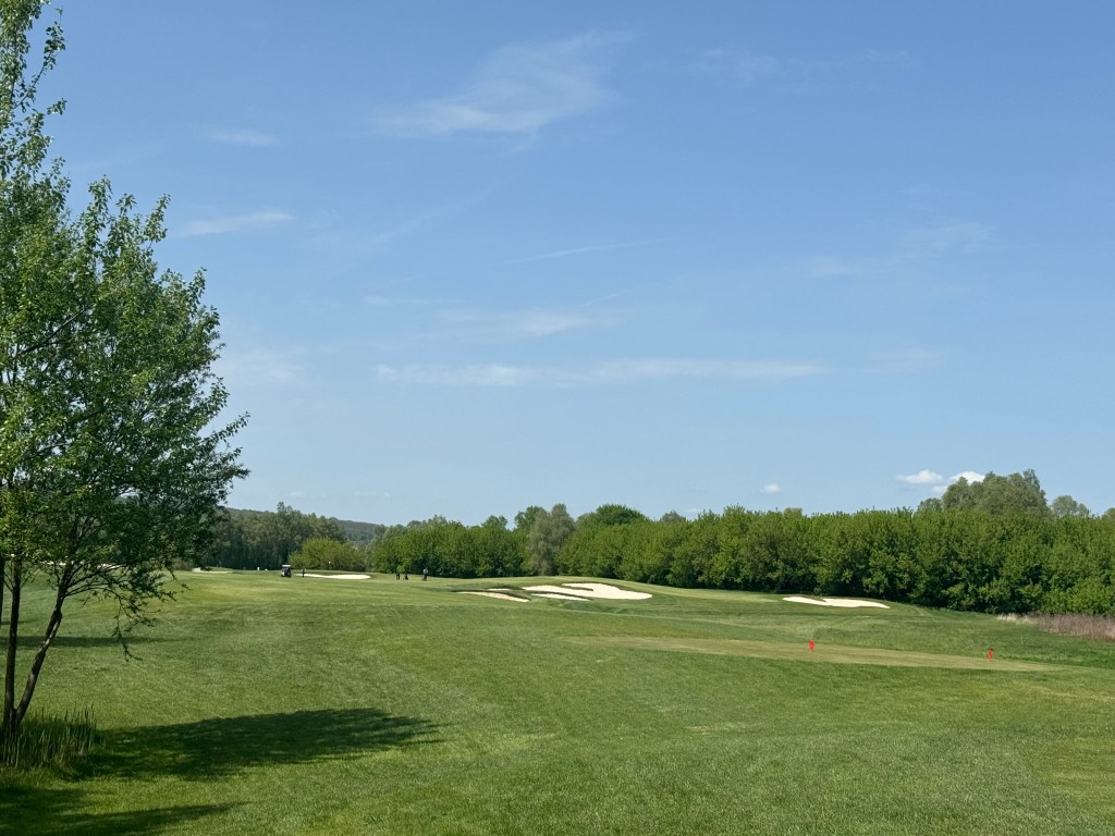 Ganz ausgezeichnet gefällt mir die 13, mit leuchtend gelbem Rapsfeld im Hintergrund. Spielt man die Bahn links an und der Ball rollt bis vor die Bunker, ist der Winkel für den zweiten Schlag auf das Grün perfekt. Hammer-Design auch auf der 14: Nach der Rechtsbiegung teilt sich die Bahn längs, aus der Ferne nur als hell- und dunkelgrüner Grasstreifen zu erkennen. Zwischen Fairway links oben und rechts unten sind allerdings schon ein paar Höhenmeter und der Schlag aufs Grün je nach Position dadurch höchst unterschiedlich. 4 – 3 – 4 – 5 ist der Rhythmus der letzten vier Bahnen. Die 15 moderat lang, die 16 ein zahmes Par 3. Dafür führt die 17 im 90-Grad-Winkel rechts über einen Teich. Longhitter spielen wahrscheinlich vom Tee Richtung Grün, ich wähle die vom Grün weiter entfernte, schmale Landezone vor den Bunkern links vom Teich und notiere immerhin ein Bogey. Die 18 dann, wie es sich gehört, spektakulär bis zum Schluss, stark nach rechts hängend, links oben der Clubhaus-Teich mit Springbrunnen, weißleuchtende Grünbunker und das Restaurant lockend im Hintergrund.