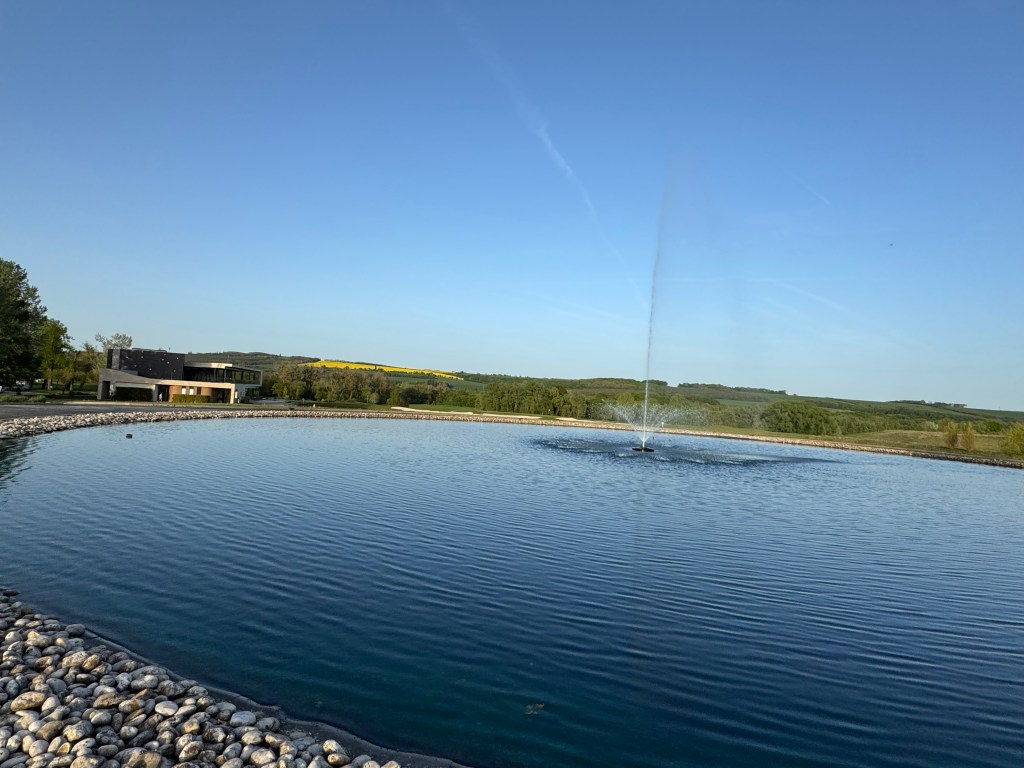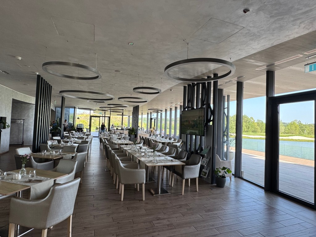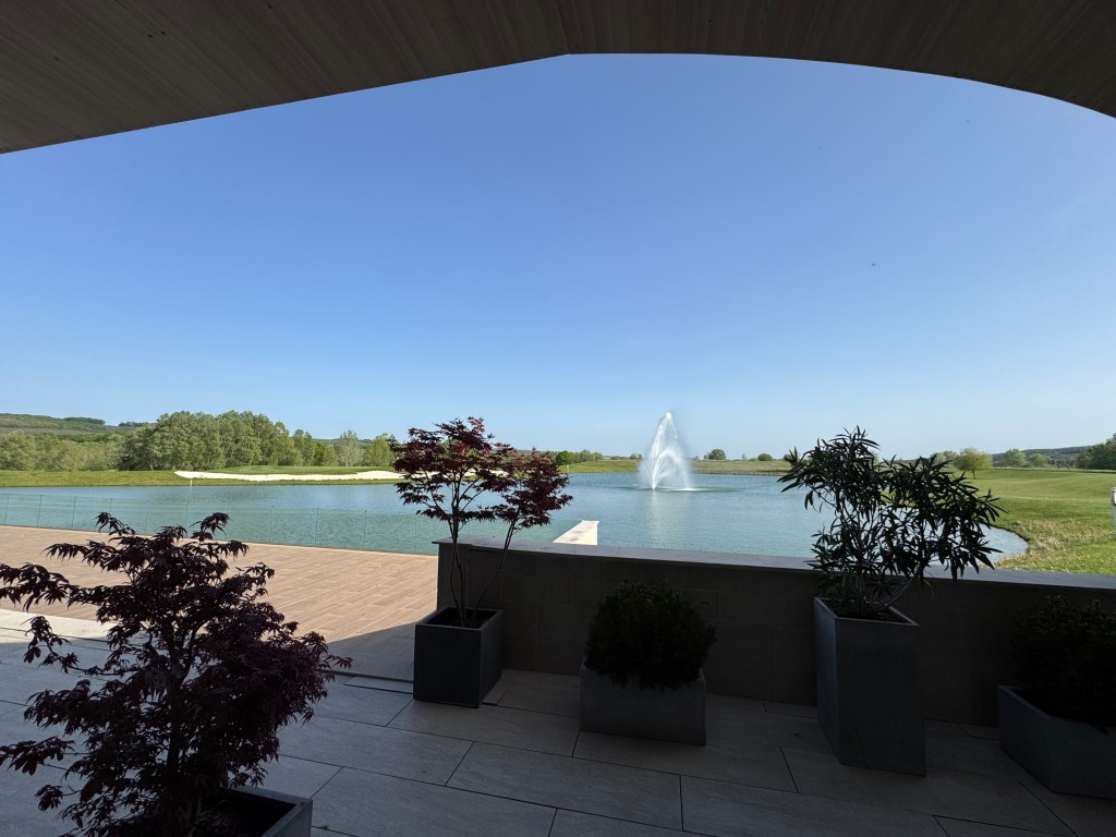Gut, die Fahrt nach Zala Springs zieht sich ein wenig. Über die Grenze nach Ungarn, via Sopron, erst breite Autostraßen, schließlich holprige Landstraßen durch Wälder und kleine Dörfer. Dann endlich linker Hand die gewundene Einfahrt, ein Kreisverkehr mit riesigem Springbrunnenpool in der Mitte, der Blick aufs Clubhaus rechts und die Hotelhäuser links. Das Clubhaus hochmodern mit riesiger Terrasse und Teichblick. Neben dem stytlishen Restaurant die Hotel- und Golfrezeption und der angeschlossene Proshop. Der Empfang ist herzlich, wir sind neun Personen und checken für zwei Nächte im Hotel ein.