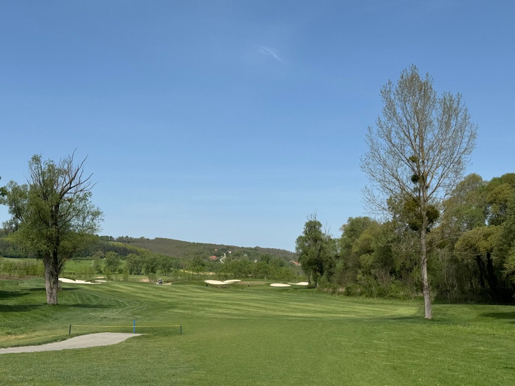An Tee 1 erwartet uns strahlender Sonnenschein und das großzügige Puttinggreen, das uns einen Vorgeschmack auf die hohe Geschwindigkeit der Grüns gibt. Bahn 1 verläuft leicht bergab und biegt dann nach rechts, unsere Abschläge finden wir 70 Meter weiter als erwartet – das Bermudagras ist kurz, der Boden hart und der Roll einfach eine Freude: (nicht nur) ich habe unglaubliche Längen an diesem Tag ;-). Das schwierigste Loch wartet der Platz gleich mit der 3 auf: Das S-förmige Par 5 führt anfangs fast im rechten Winkel um einen Teich links, zum Grün geht es an strahlend weißen Bunkern leicht rechts bergauf. Grandiose Bunkerlandschaft auch auf der 4, ehe mit der 5 ein kurzes Par 3 mit querliegendem schmalen Grün ins Haus steht, das nicht ganz einfach zu treffen ist. Bei den Par 4 der 6 und 7 modelliert das Gelände die Bahnen und macht sie schmal. Das Par 3 der 8 spiele ich intuitiv rechts an, weil sein Grün stark gen Bunker und Wasser hängt und lande prompt im Grünbunker gegenüber. Großzügig führt die 9 um einen weiteren Teich, an dem links zwei der Hotelkomplexe und das Spa stehen. Das Grün lässt sich nur hoch anspielen, rechts Bunker, links Wasser. Flach anspielen ist in Zala Springs ohnehin nie eine gute Variante, sind die Bälle einmal auf dem Grün, sind sie weg.