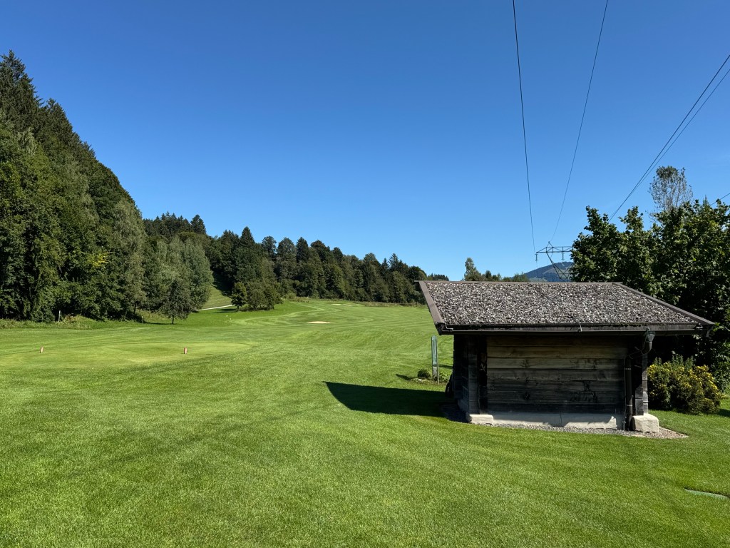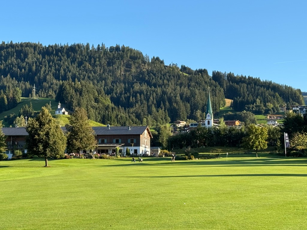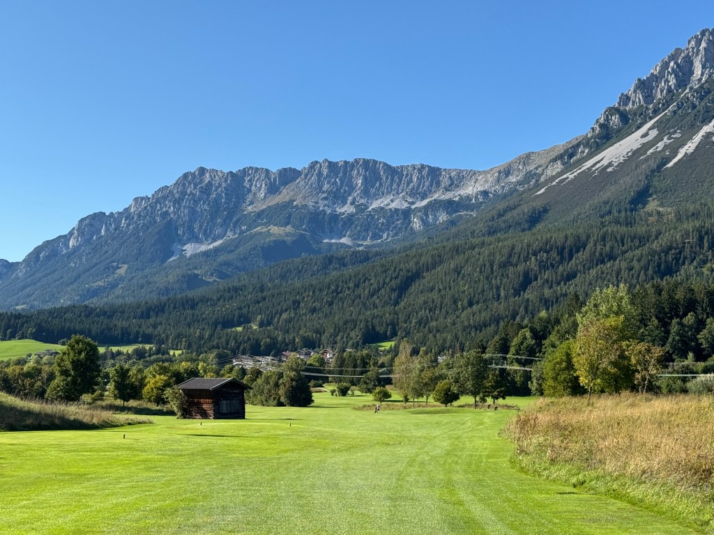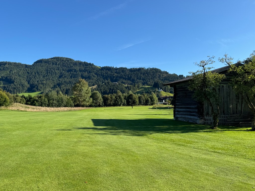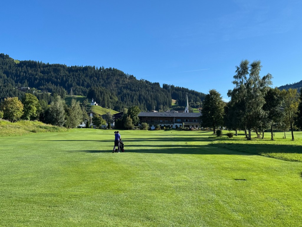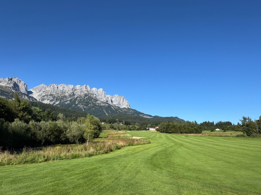Panorama, Panorama, Panorama! In der einen Richtung das gewaltige Bergmassiv des Wilden Kaisers, in der anderen der namensgebende Ort Ellmau mit Kirchturm, Bergkapelle und Kuhweiden, über allem fetzblauer Himmel. Mehr Tirol geht nicht. Die Golfbahnen sind breit und so gestaltet, dass man diese Ausblicke durchaus genießen kann.