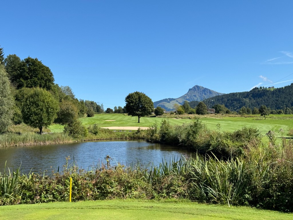 Auch wenn wir uns in Tirol befinden: der Platz ist großteils eben. Gut, ab und zu ein erhöhtes Grün wie auf der 1 oder der 3. Ansonsten spielt man auf sanft ansteigenden oder leicht abfallenden, sehr breiten Bahnen. Frontales Wasser gibt es erstmals auf der 4, und dort auch nur von Gelb. In der Landezone ein einsamer Baum, im Hintergrund diesmal das Kitzbüheler Horn. Die 5 kommt scheinbar sehr breit daher und ohne besondere Hindernisse, die Tendenz nach links ins Out zu schlagen, ist aber seltsamer Weise groß in unserem Flight, obwohl uns die Mitspielerin mit Platzkenntnissen gewarnt hat. Optisch ganz großartig die 7, leicht bergauf zu einem links liegenden Grün, der Wilde Kaiser immer im Blick. Auf der 8 warnt uns unsere Tirolerin beim Anspielen auf das Grün vor dem Teich, über links spielt sich die Bahn aber sicher. Die 9 ist völlig unspektakulär, wenn du auf diesem Par 3 Fehler machst, liegt es nur an dir. (Vielleicht hat am Tee aber auch der Blick nach rechts abgelenkt, zum Holzhäuschen am Teich und dem Kaiser dahinter. Fast schon kitschig.)