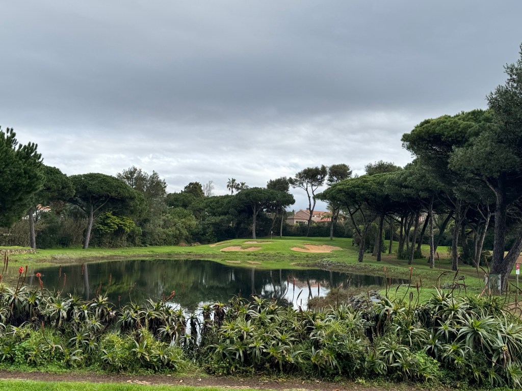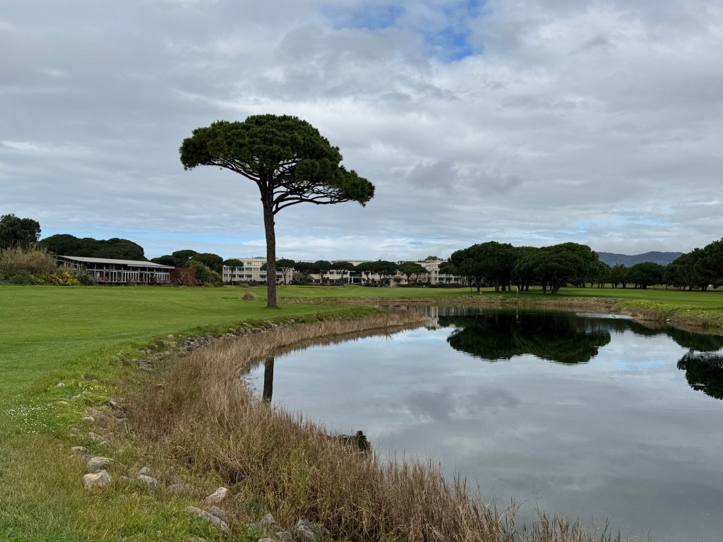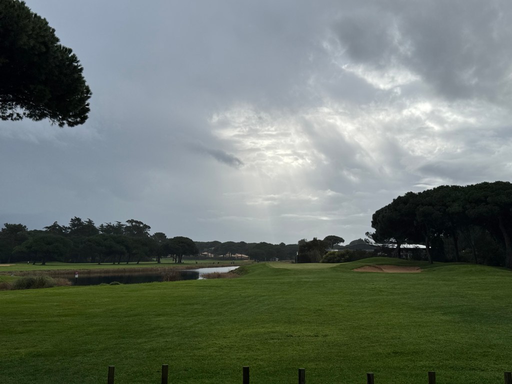 Auf der 5 hellt sich nicht nur der Himmel, sondern auch meine Stimmung auf: Das wunderschöne Par 3 über einen Teich – 140 Meter von Gelb, 88 von Rot, bietet willkommene Abwechslung. „Snake“ und „Lucky Seven“ schlängeln sich wieder durch Pinien, die die Fairways verdammt schmal machen, und Longhitter wahrscheinlich dazu verleiten, da und dort über die Bäume zu spielen. Am schmalsten wohl das Par 4 der 8 mit Hcp 1. Ich habe bei Golfplätzen ein fotografisches Gedächtnis, muss aber zugeben, dass ich mich nach nur einer Runde Quinta da Marinha schwertue, die ersten elf Bahnen voneinander zu unterscheiden. Sieht man von der 10 ab, die „The Lakes“ heißt und dementsprechend mal Wasser rechts, links oder vorne bietet. Dafür jetzt kein Wasser mehr von oben.