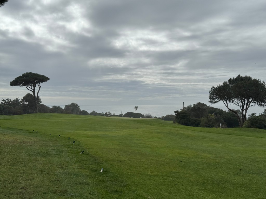 Aber dann die 12. Das zweitschwierigste Loch des Platzes, ein Par 4, fällt leicht ab, kippt nach rechts, biegt nach links und macht einfach richtig Spaß! Mein 2. Schlag muss blind abwärts, ich halte mich nicht links genug und suche wenig später meinen Ball sehr nahe an der nebenliegenden 18. Die 13 weitet sich ab der Mitte, fällt stark nach rechts und endet auf einem Grün mit Meer dahinter (und auch dorthin abfallend natürlich). Das unwegsame Gelände macht es notwendig, dass man auf dem Par 3 der 14 einen tiefen Graben überspielen muss, was aber kein wirkliches Mirakel ist und dadurch Freude macht. Wellen dann nicht nur auf dem sehr schönen, aber auch sehr schmalen Par 4 der 15, sondern auch als Geräuschkulisse von links unten: Dort tost die Brandung an die Küste. Ein unscheinbares Par 3 „Sweet Sixteen“ leicht hügelan, ehe man sich auf der 17 „Step by Step“ Richtung Grün kämpft. Die 18 windet sich noch einmal um grasige Hügel in der Mitte und der Platz endet, wie er begonnen hat. Zwischen Pinien und erstaunlich trocken.
